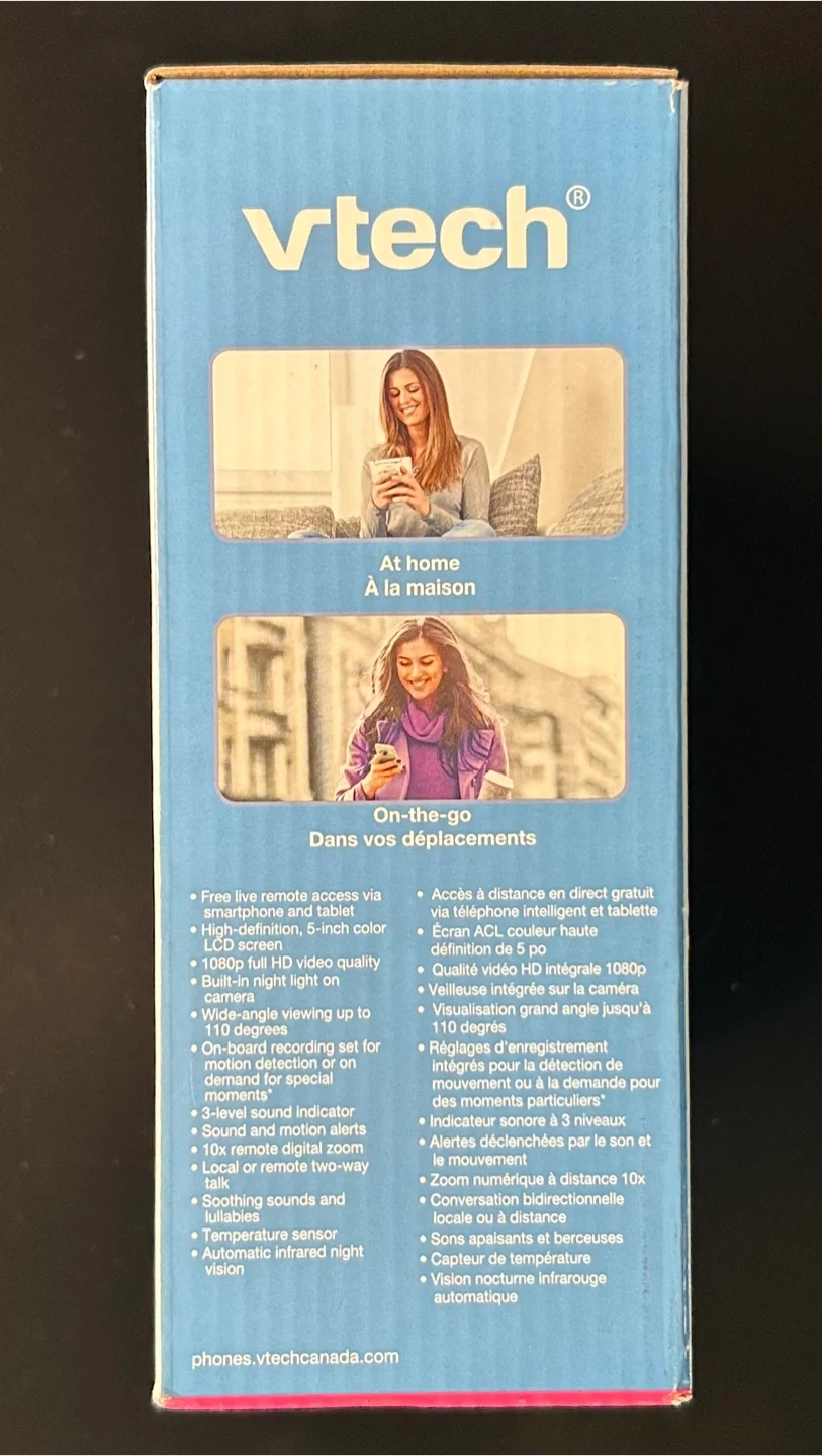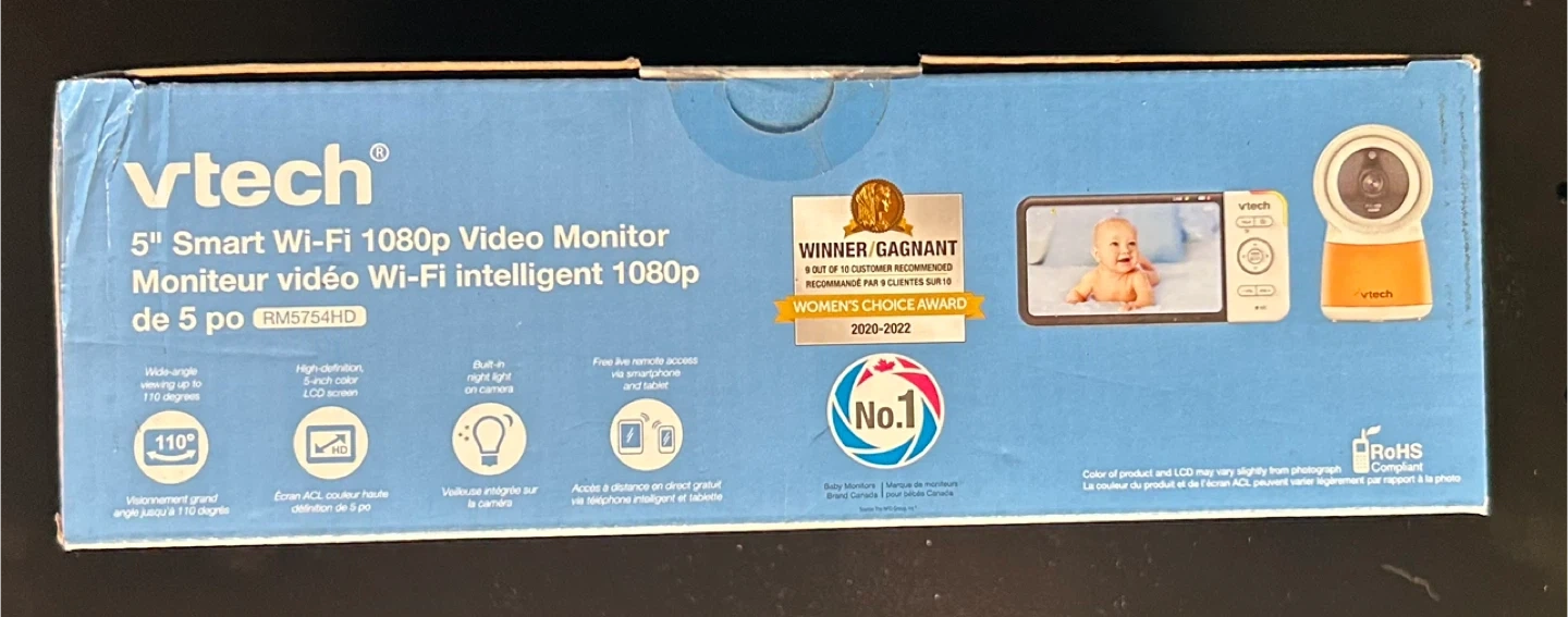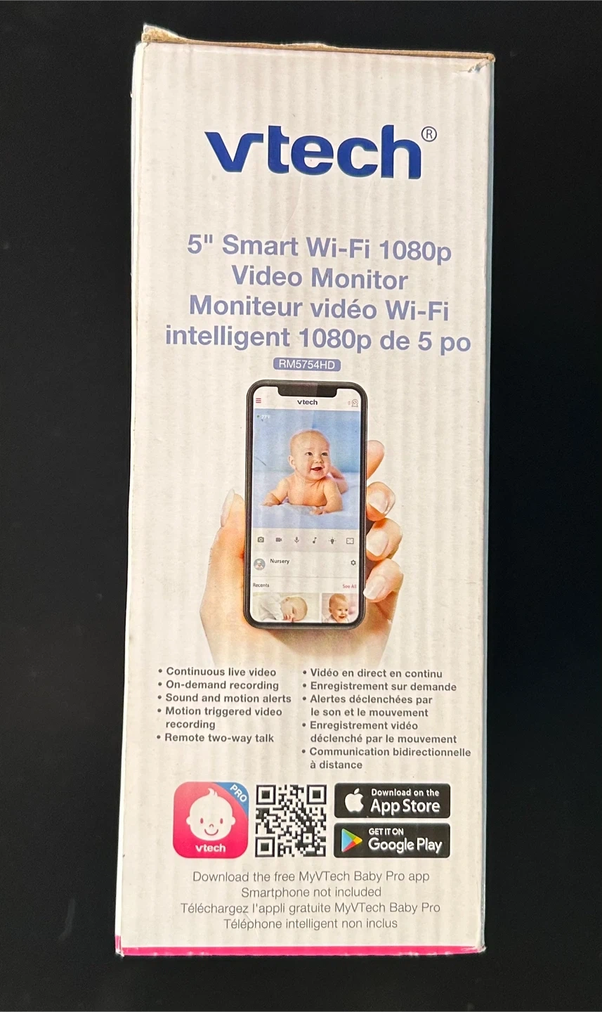 201Selling a VTech 5" Smart Wi-Fi 1080p Video Monitor. It comes with the box. Key features include: - 5-inch colour LCD screen - 1080p full HD video quality - Wide-angle viewing up to 110 degrees - On-demand recording for motion detection - Soothing sounds and lullabies - Temperature sensor - Automatic infrared night vision