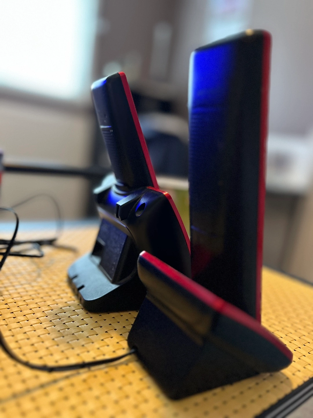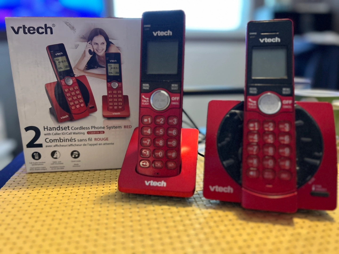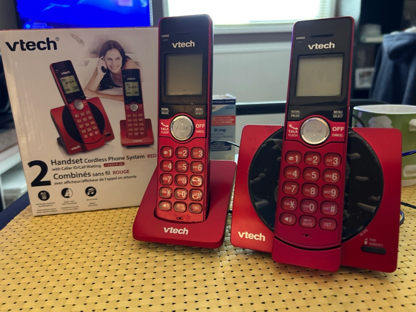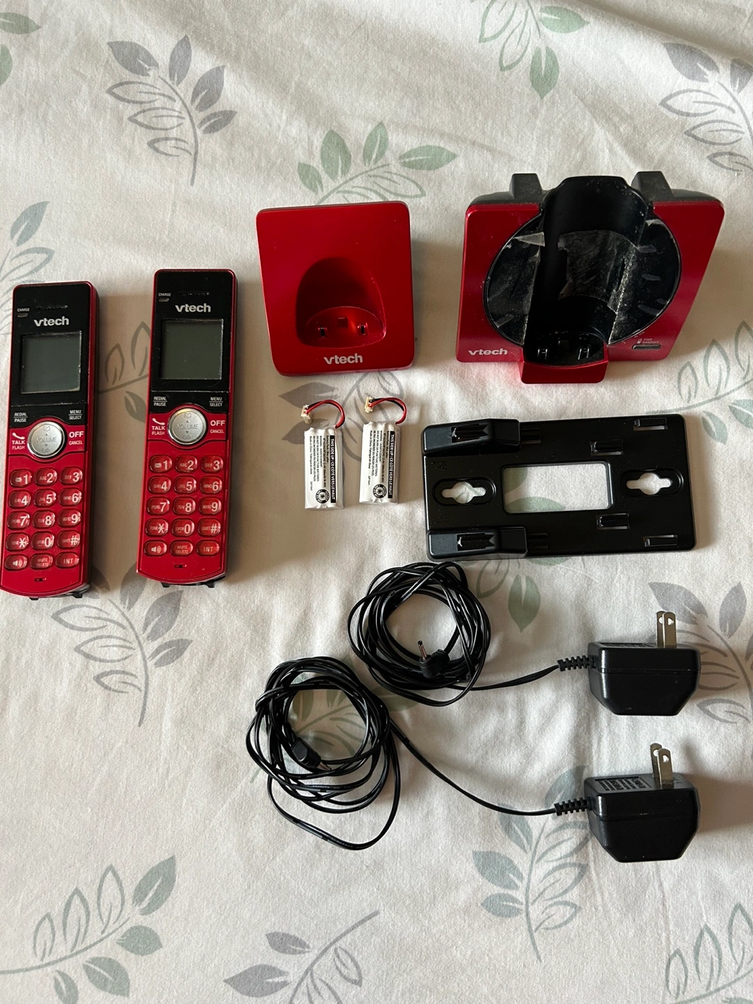 85Red cordless phone with caller ID. Two handsets, charging cradles, wall mount and all necessary cords and adaptors included. Batteries included Available for pickup or meet up