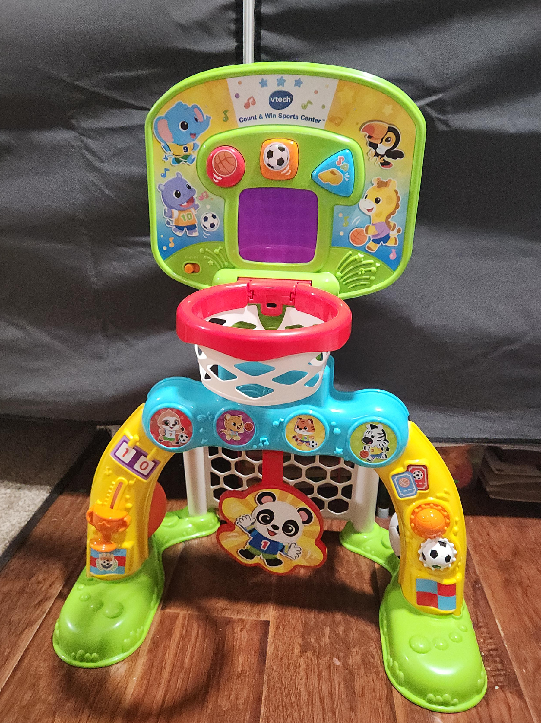 31A fun and interactive toy that combines basketball and soccer with counting and learning activities. Comes with a soccer ball and basketball ball that counts when you sink a basket, and a removable interactive goalie for soccer. Has 3 buttons for learning and songs, a sliding trophy and spinning ball gears on the sides. Also has a holder on each side to store the balls when not in use and 2 different height settings and auto shut off when not in use. Practically new and in excellent condition.