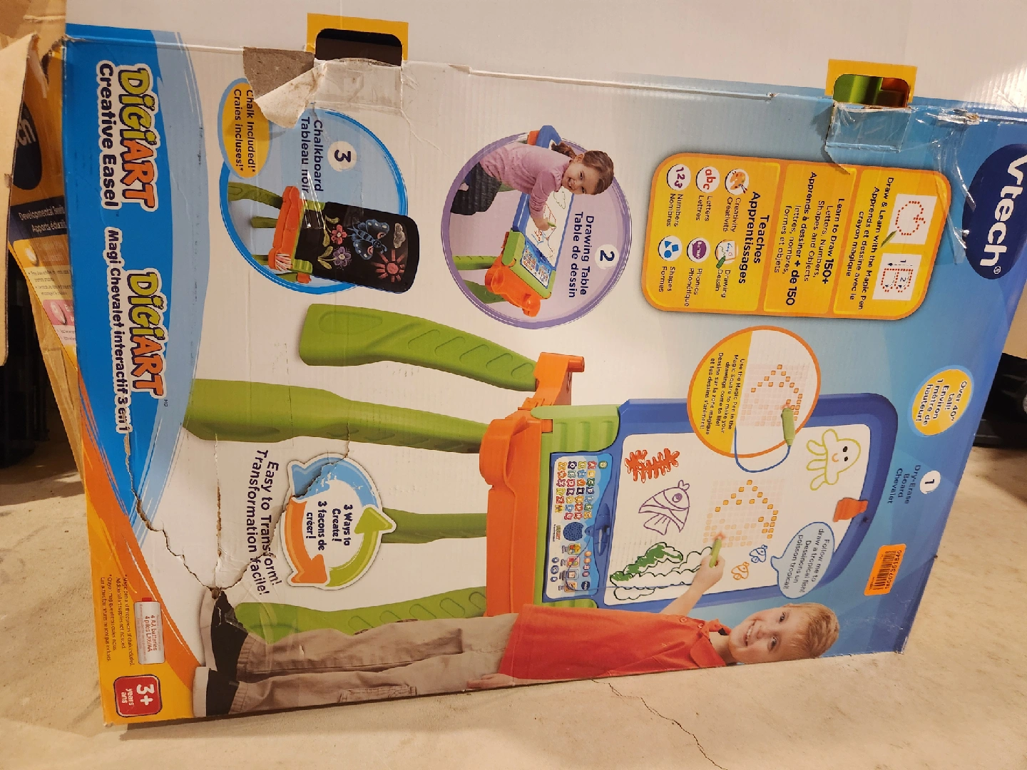 Selling a VTech DigiArt Creative Easel that's in like-new condition! It's a Magi Chevalier Interactif 3-en-1, perfect for little artists aged 3+. This easel easily transforms into 3 ways to create and learn. Comes with all the original components and the box