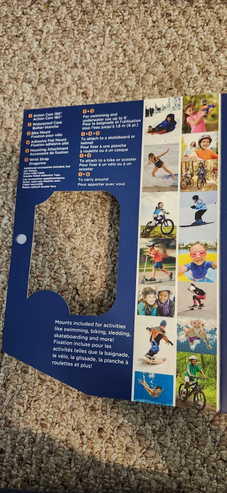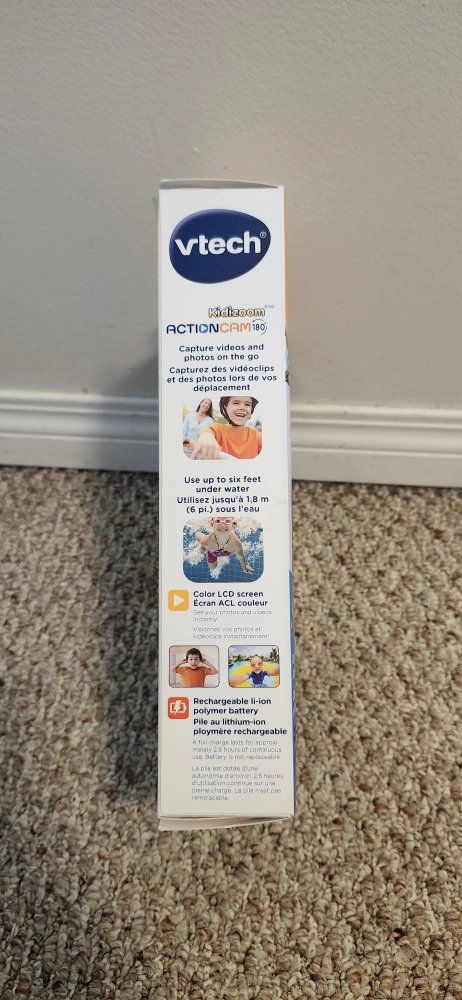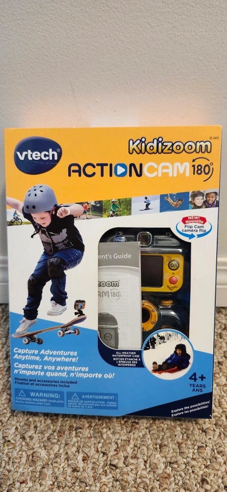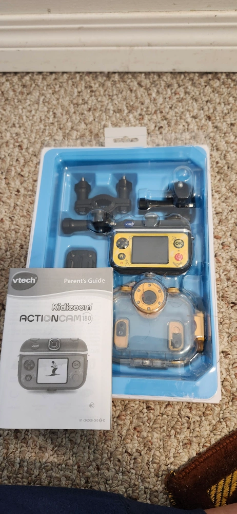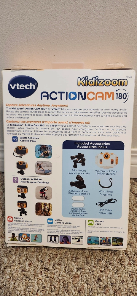 Selling a brand new VTech Kidizoom Action Cam! It's still in the box and has only been used a couple times. It's waterproof up to 6 feet underwater, perfect for swimming and more. Comes with mounts for swimming, biking, skateboarding, and other activities. The box includes the camera, waterproof case, bike mount, adhesive mount, wrist strap, USB cable, and user manual