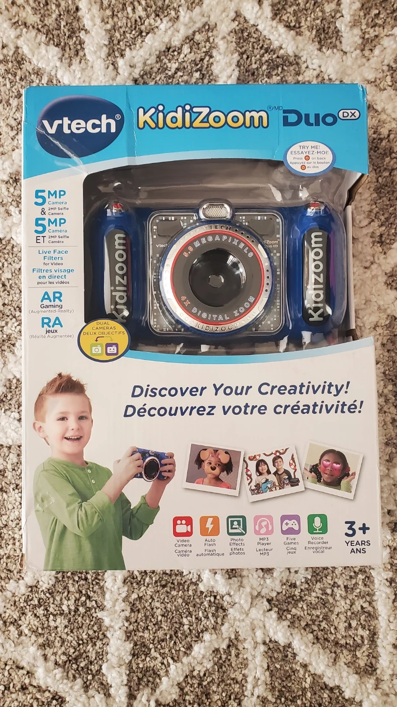 10Looking to sell a VTech Kidizoom Duo DX digital camera! It's perfect for kids aged 3+ years. This camera has both front and rear lenses for taking photos and videos. It also has built-in games and photo effects for extra fun. It's in great condition and comes with all original packaging!