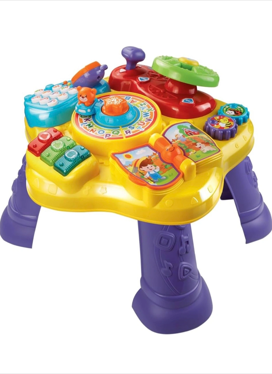 The VTech Little Smart Top is an interactive learning table designed for toddlers. It features various activities like a steering wheel, piano keys, and a book to encourage exploration and development. Great for little ones!
