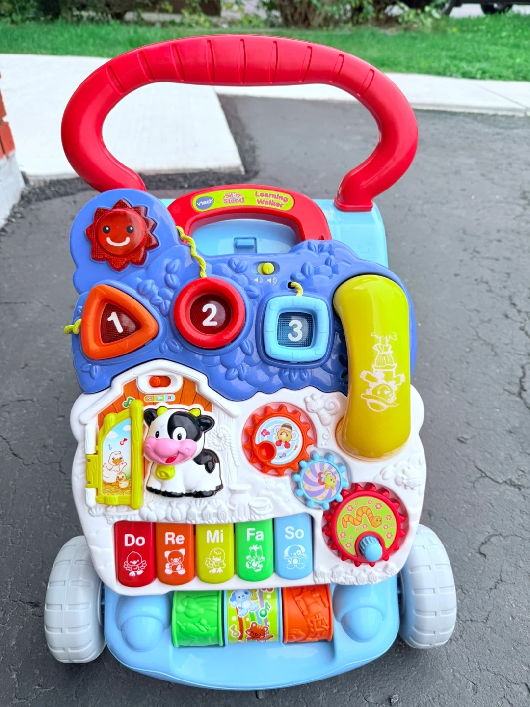 10This VTech Sit-to-Stand Learning Walker is perfect for little ones learning to walk! It's in great condition and ready for a new home. The walker features a variety of activities to keep your child entertained and engaged as they develop their motor skills. Recommended for ages 9 months and up