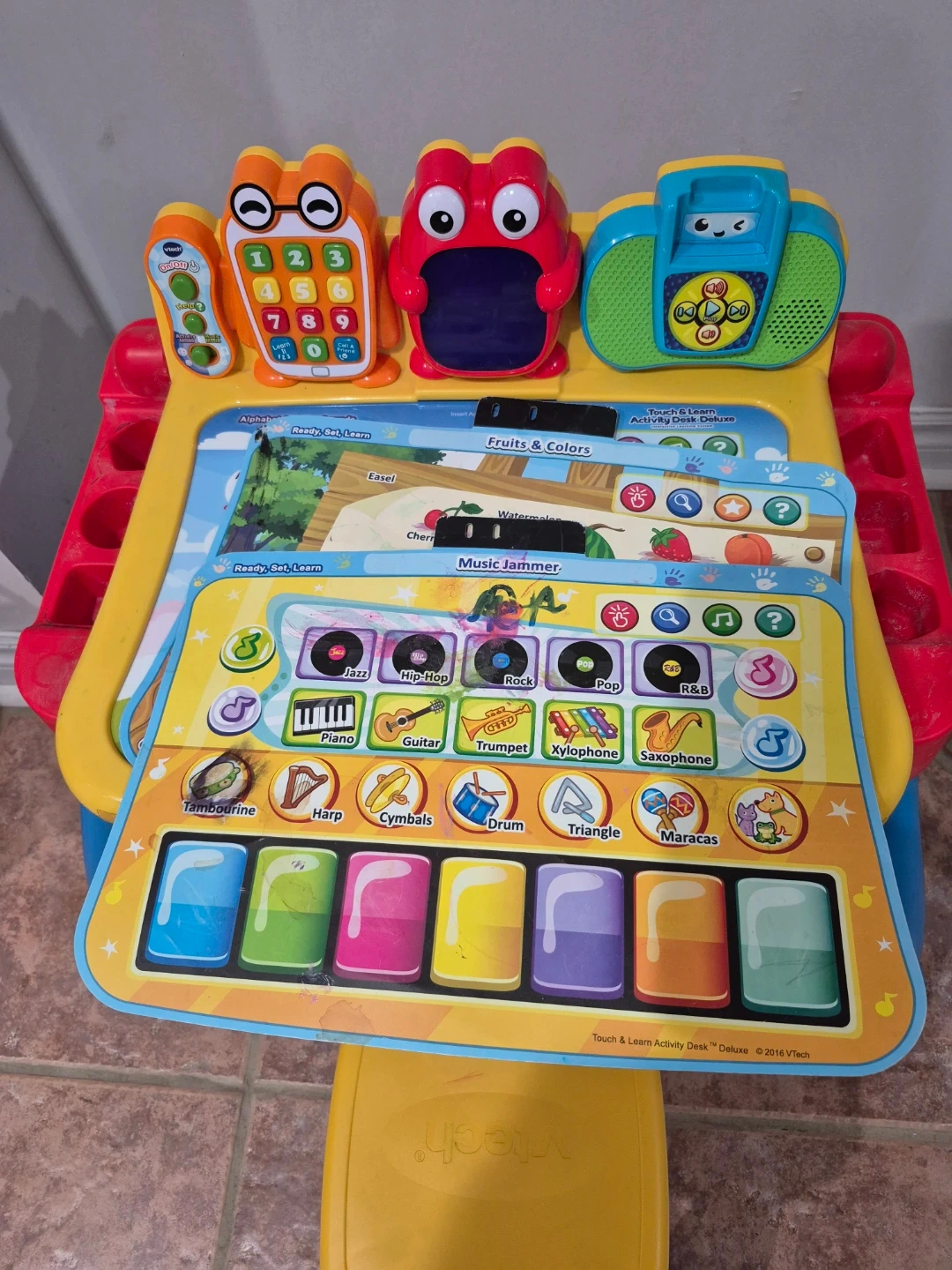 10Selling a VTech Touch & Learn Activity Desk Deluxe! This interactive desk is perfect for little ones learning their alphabet, numbers, colours, and more. It includes various activity pages and musical instruments. Comes with a stool.