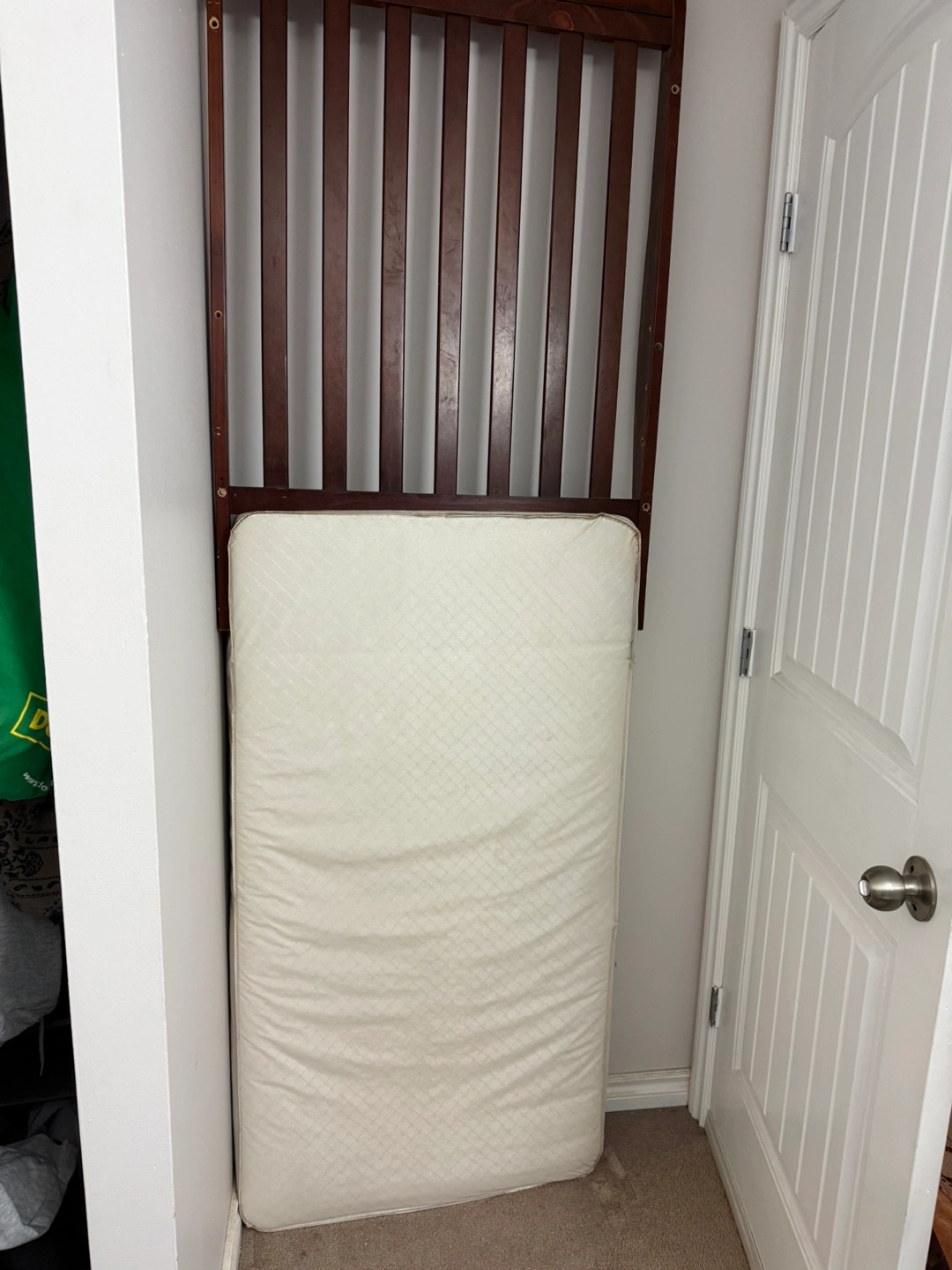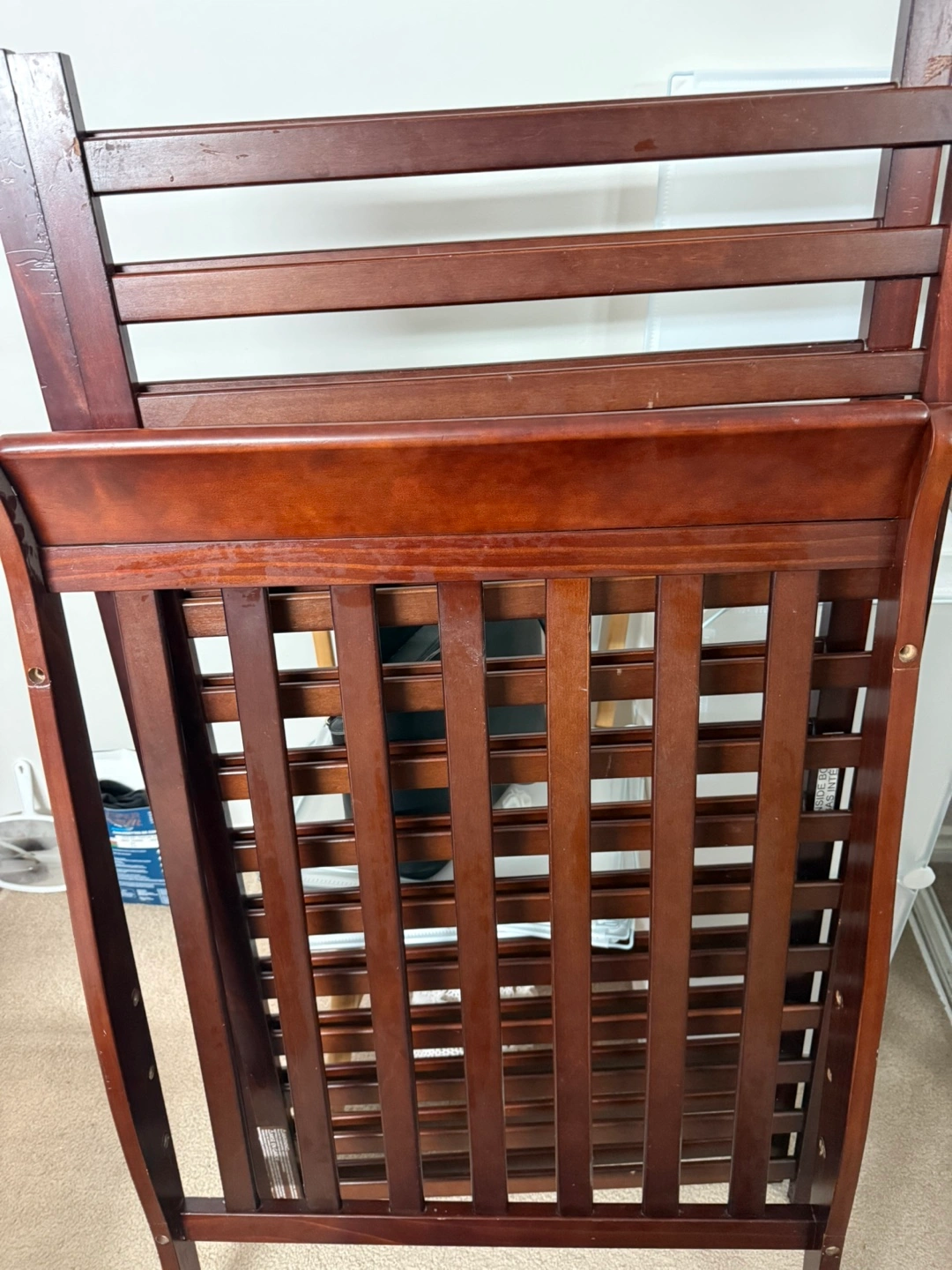 Selling a convertible crib and mattress. The crib is a dark wood colour and in good condition. Includes the mattress and frame. Perfect for a new baby or toddler!