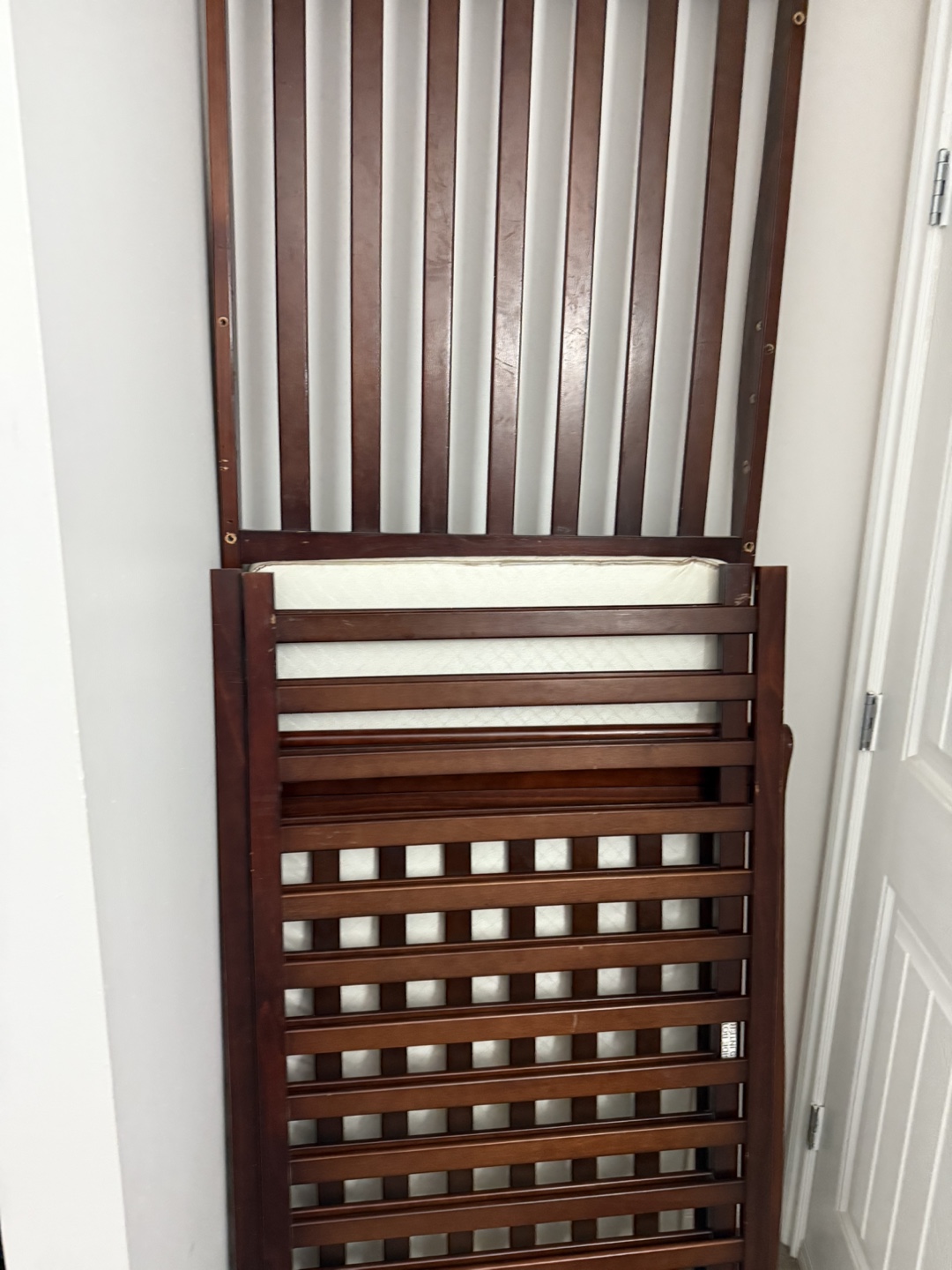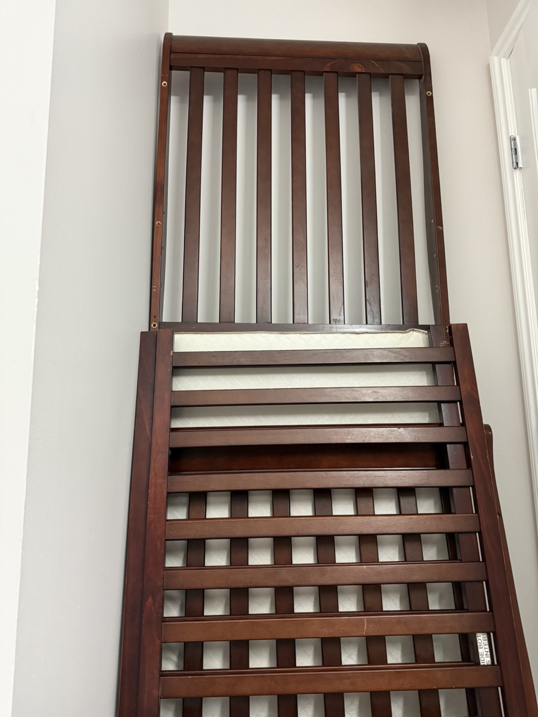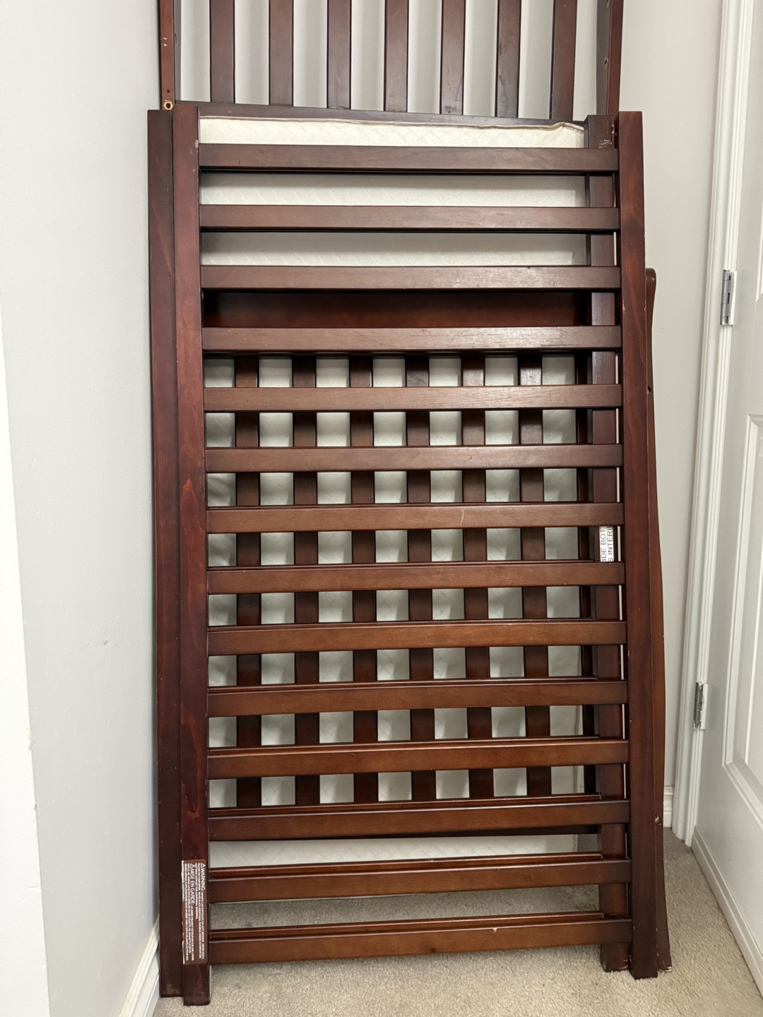 Selling a convertible crib and mattress. The crib is a dark wood colour and in good condition. Includes the mattress and frame. Perfect for a new baby or toddler!