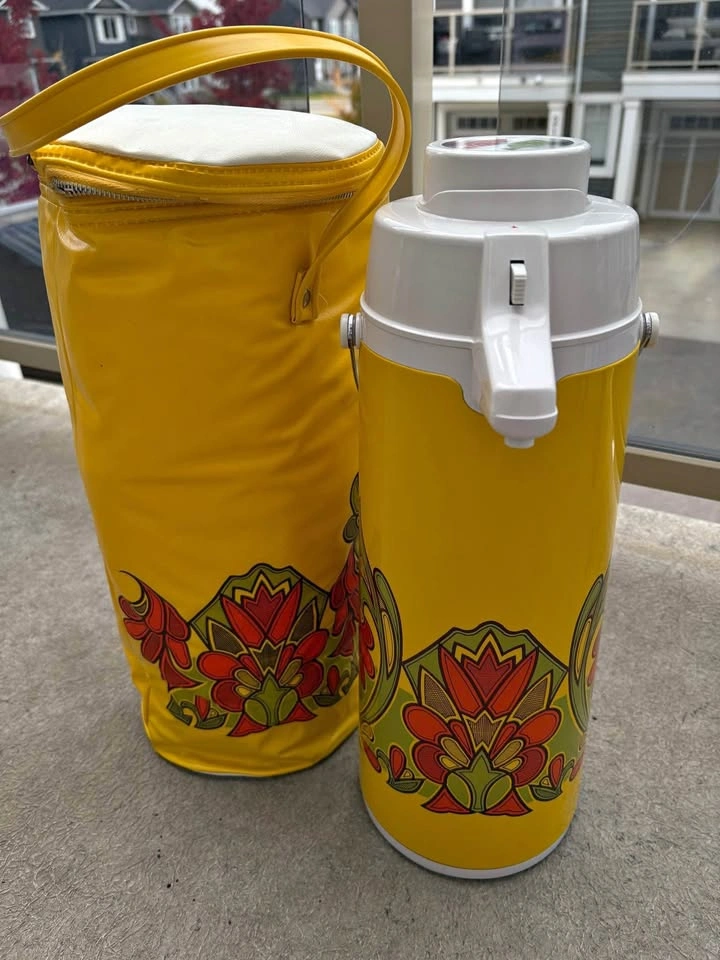65This is a vintage 1970s Peacock Air Pot, a thermos-style beverage dispenser. The yellow dispenser is made by the Peacock Vacuum Bottle Company and features a floral pattern. These dispensers were made in Japan and were designed to keep beverages hot or cold. NEVER USED! Asking $80 or your best offer Pick up in Brighton