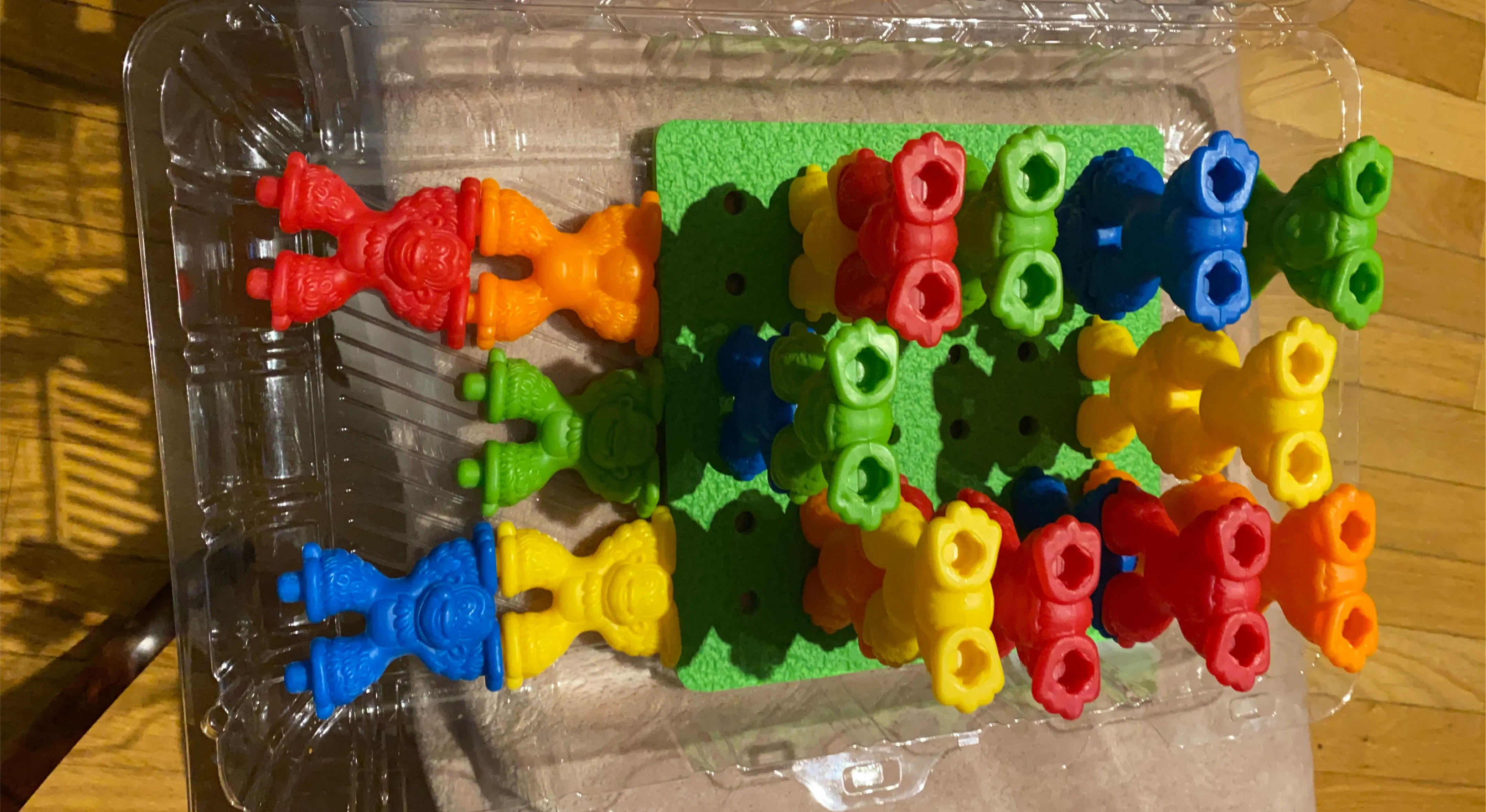 This is a set of colourful building toys. The pieces are red, orange, green, blue, and yellow. They connect together to create different structures. It's a fun toy for creative play!