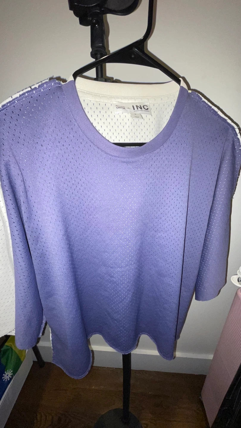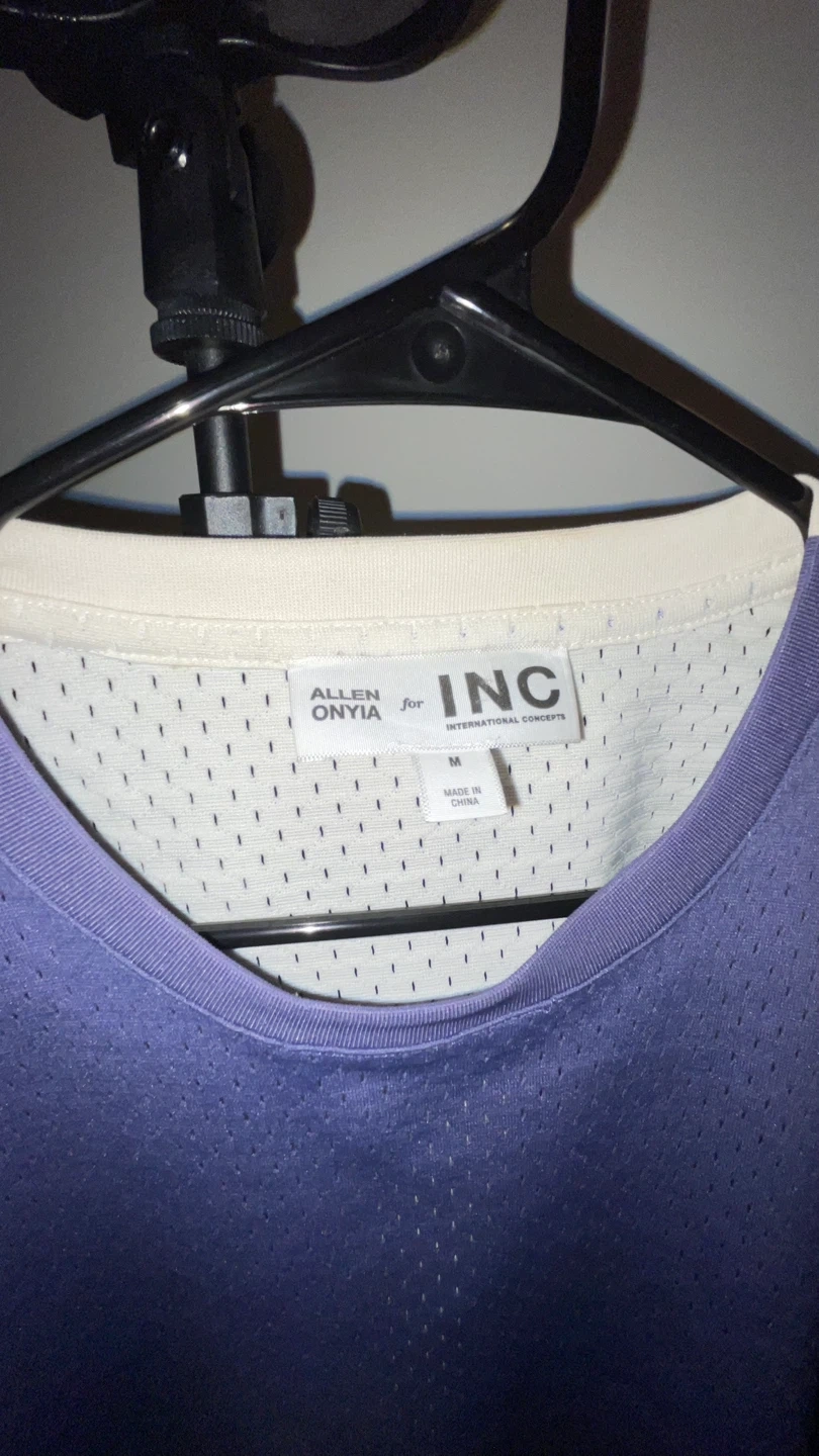 Allen Onyia for INC International Concepts shirt. It's a size medium with a breathable mesh material. This purple shirt features white trim on the sleeves and neckline.