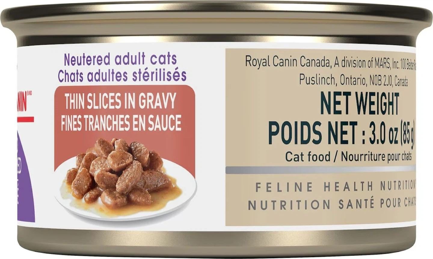 Royal Canin Feline Health Nutrition for spayed and neutered adult cats. Features thin slices in gravy. Net weight is 3.0 oz (85 g). 48 cans available.