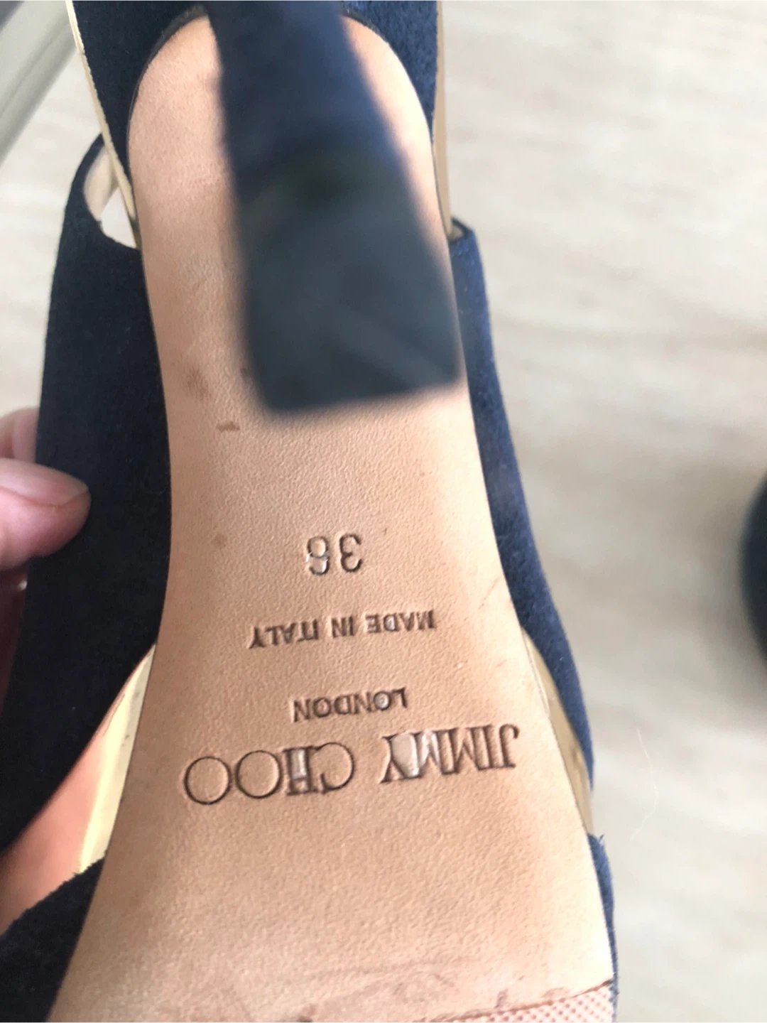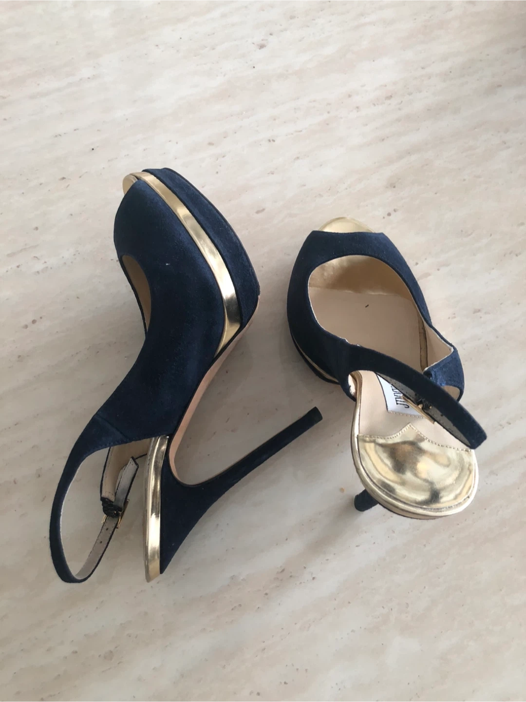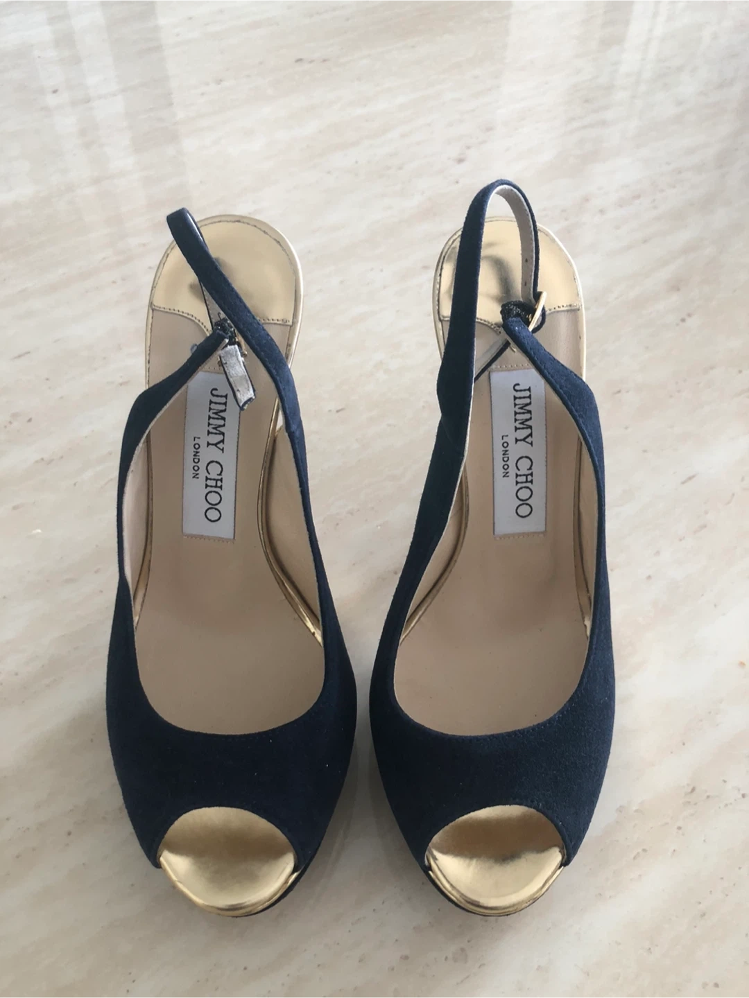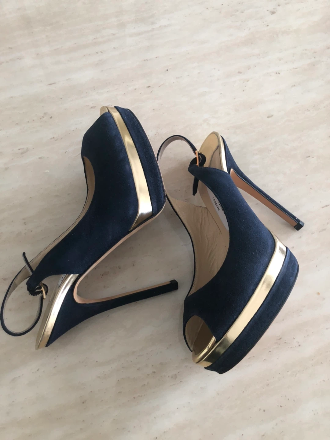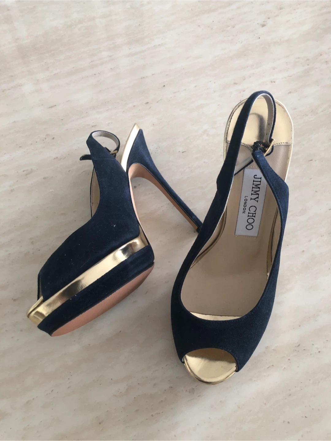 Stylish Jimmy Choo heels in navy suede with gold accents. Features a peep-toe design and platform sole. Comfortable ankle strap closure.