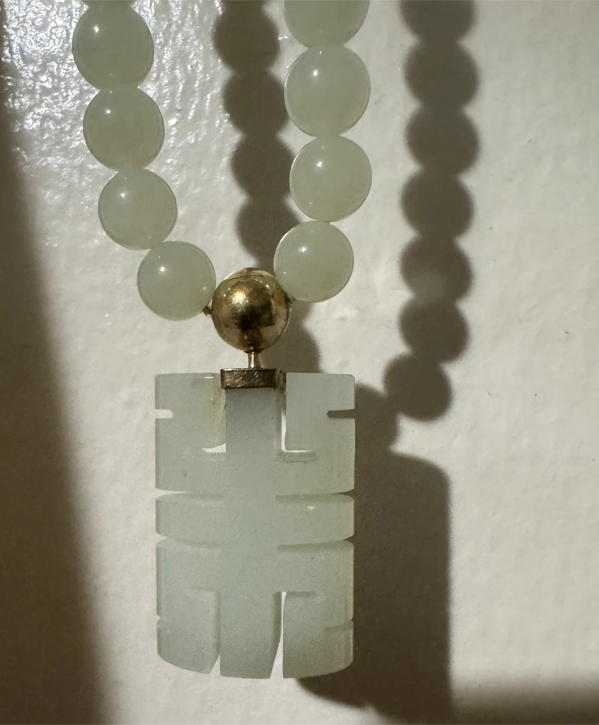 Here's a lovely jade beaded necklace for sale! It features a unique pendant design and gold-tone accents. Perfect for adding a touch of elegance to any outfit