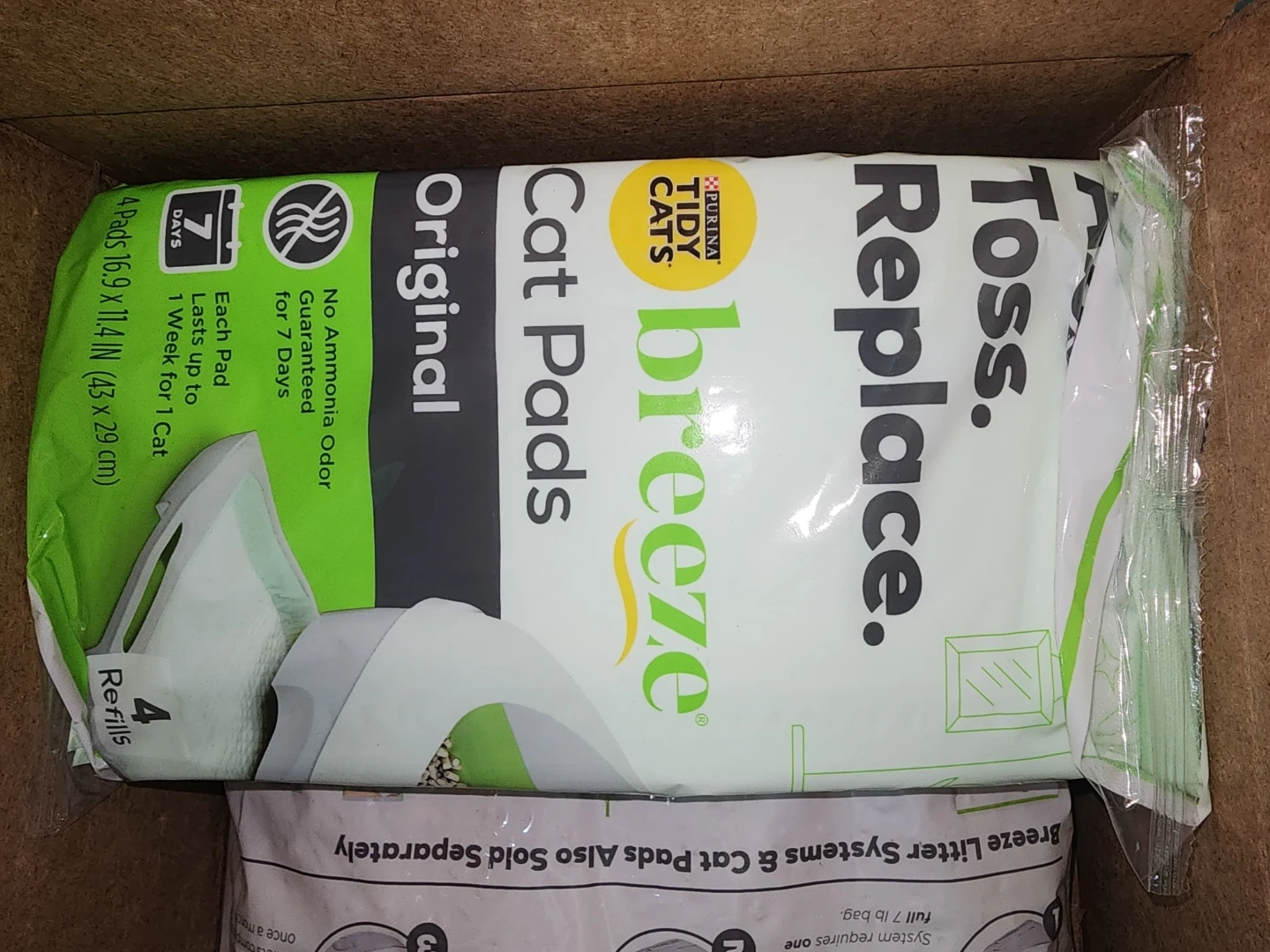 These are Purina Tidy Cats Breeze Original Cat Pads. They're designed to last up to 1 week for 1 cat and guarantee no ammonia odor for 7 days. Each pad measures 16.9 x 11.4 inches.