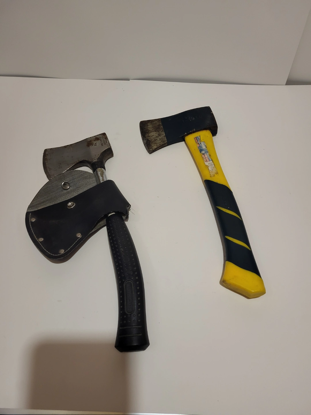 hatchets. One Mastercraft hatchet shows some rust. Yellow-handled hatchet has some wear. One hatchet includes a leather sheath. the price is for each.