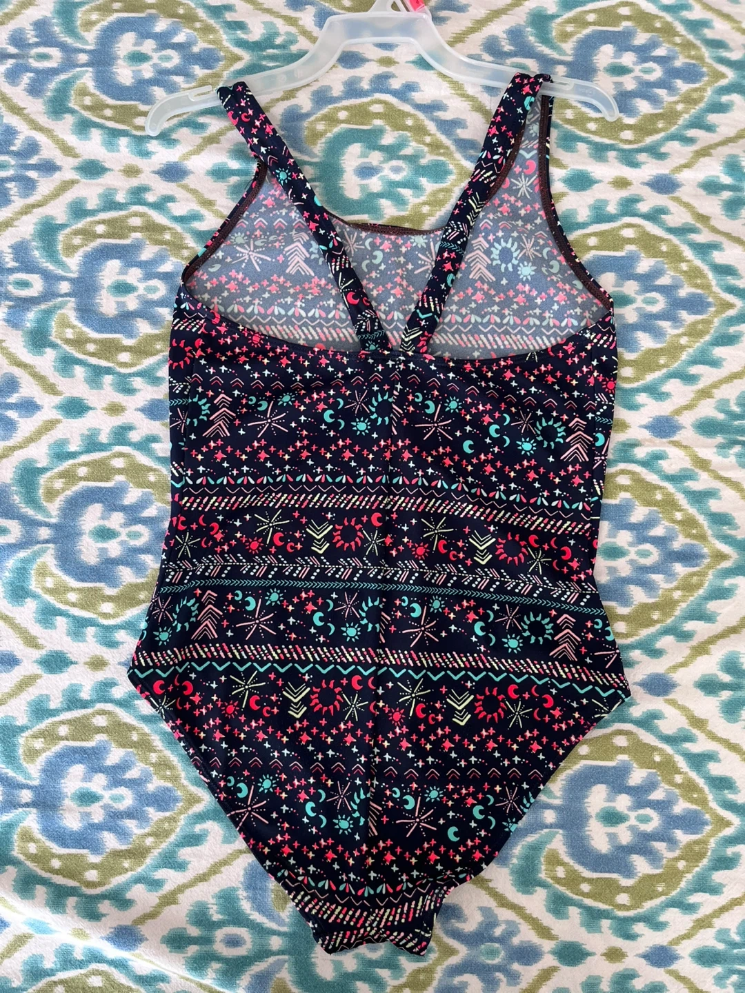 Selling a cute girls' one-piece swimsuit in size 10-12. It's in great condition and features a colourful, fun pattern. Perfect for swimming lessons or a day at the beach!