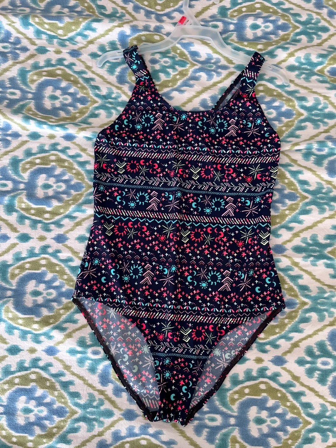 Selling a cute girls' one-piece swimsuit in size 10-12. It's in great condition and features a colourful, fun pattern. Perfect for swimming lessons or a day at the beach!