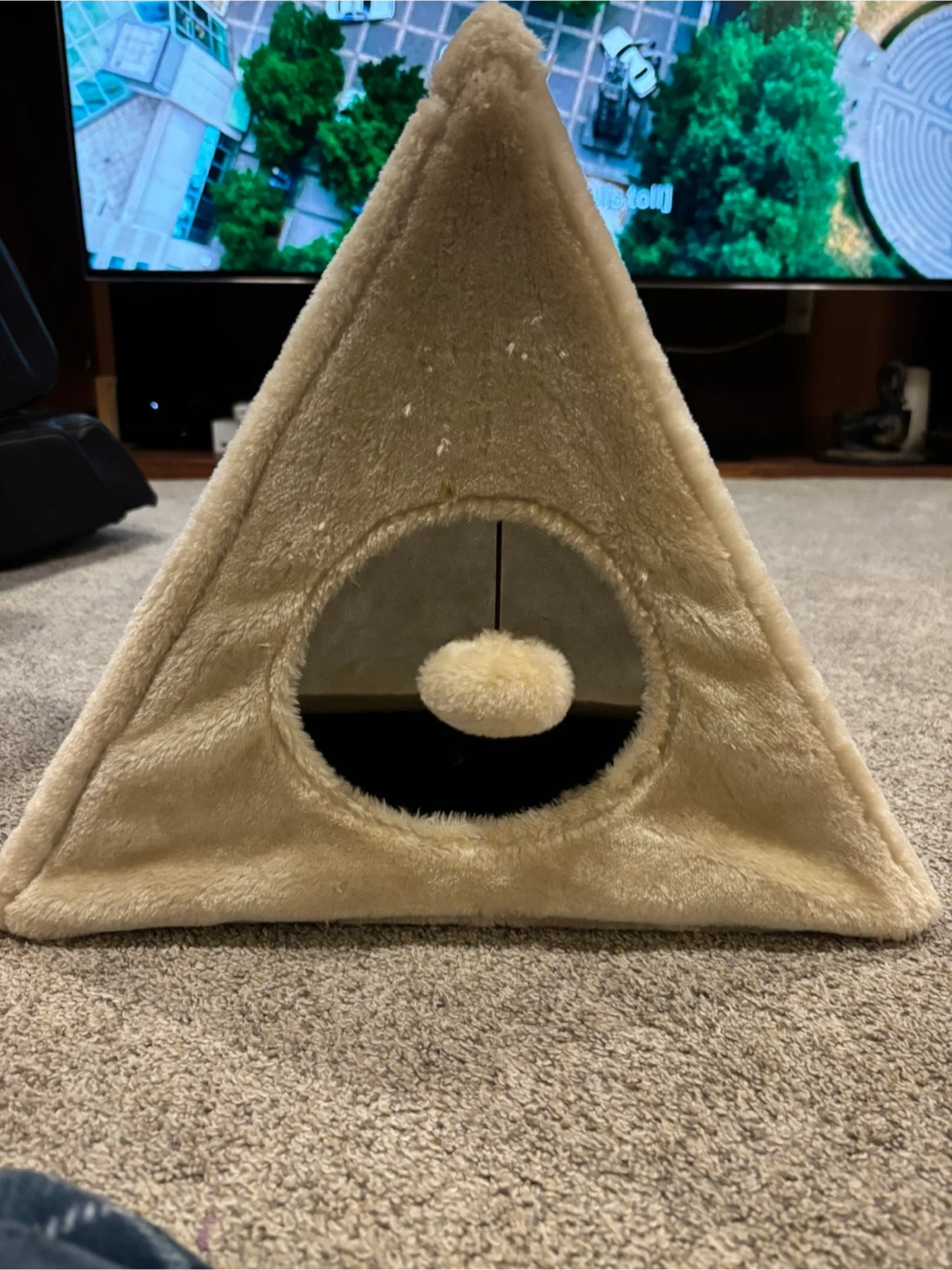 This triangular cat tent is made of soft, furry material and includes a sisal scratch pad. It's perfect for cats to play and rest in! Comes with a dangling pom-pom toy inside for extra fun.