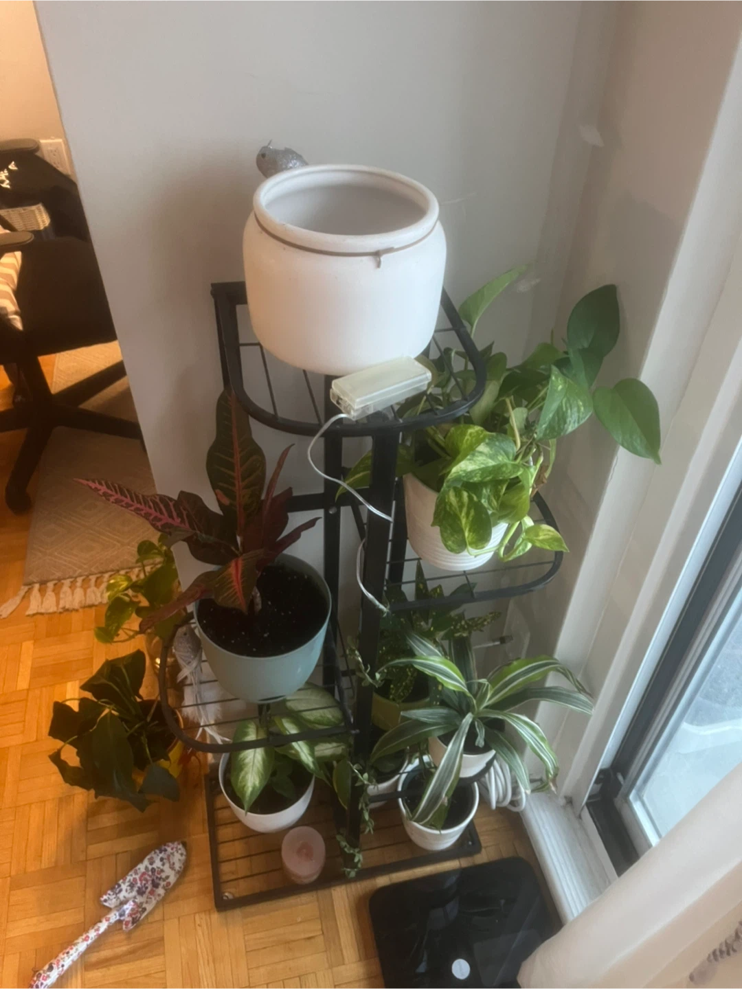 Selling a metal plant stand. It's in great shape and ready to display your lovely plants! It has multiple tiers for displaying a variety of plants. Perfect for adding some greenery to your space. The plants and pots in the picture aren’t included.