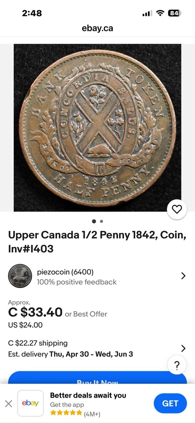 Buy & SellBank of Montreal Half Penny Token 1844Bank of Montreal Half Penny Token 1844$55This is a Bank of Montreal Half Penny token from 1844. It's made of copper.WHERE TO MEETCheck LocationView MapSELLERverifiedMustafaMarine Hamilton37837 reviews0 chats·2 favorites·6 viewsSEND CHAT TO SELLERHi Mustafa! I’m interested in your listing.Hi Mustafa! I’m interested in your listing.Get the Karrot app to chatSign In to chat