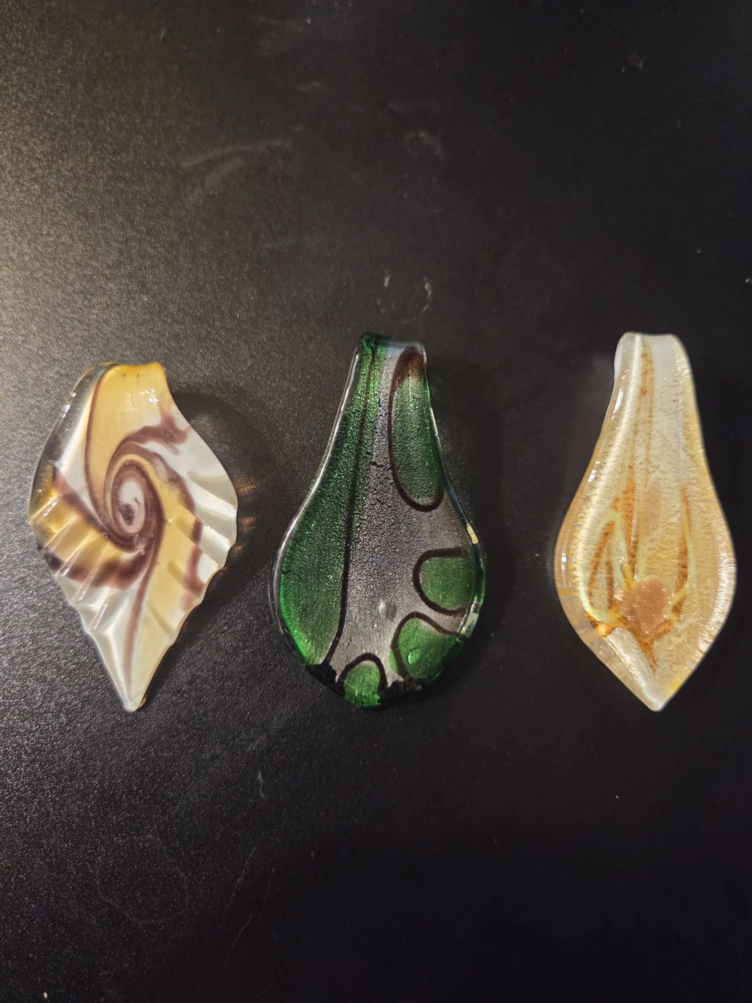 Three unique glass pendants, perfect for jewellery making or crafting! Each pendant showcases a beautiful swirl or pattern. These would be great for creating custom necklaces