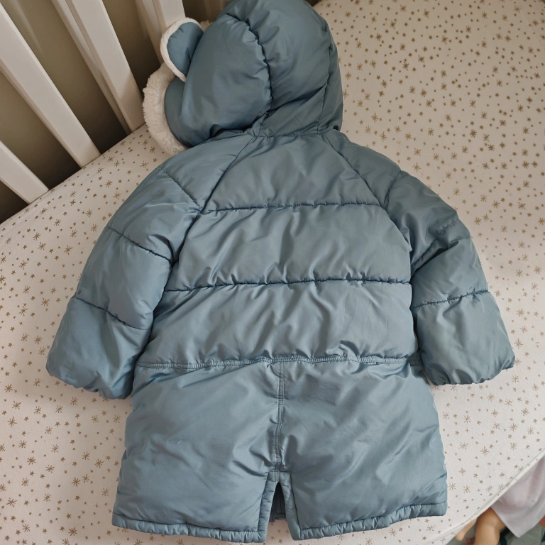 Baby’s blue puffer jacket. Features a sherpa-lined hood with cute bear ears. Zipper closure. Two pockets. Warm and cozy.