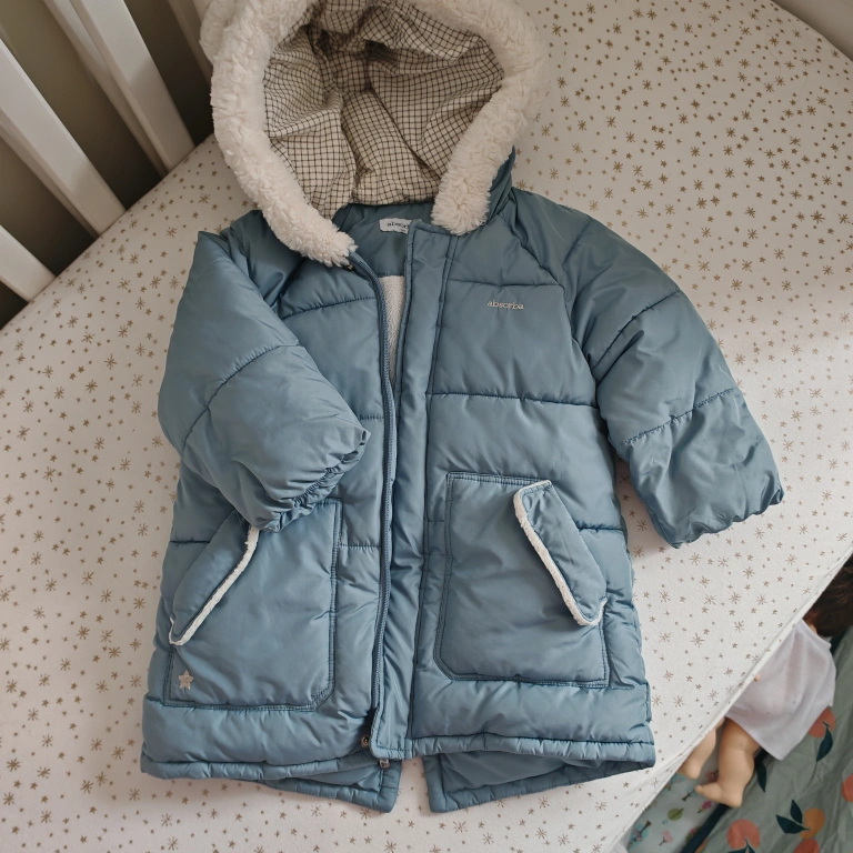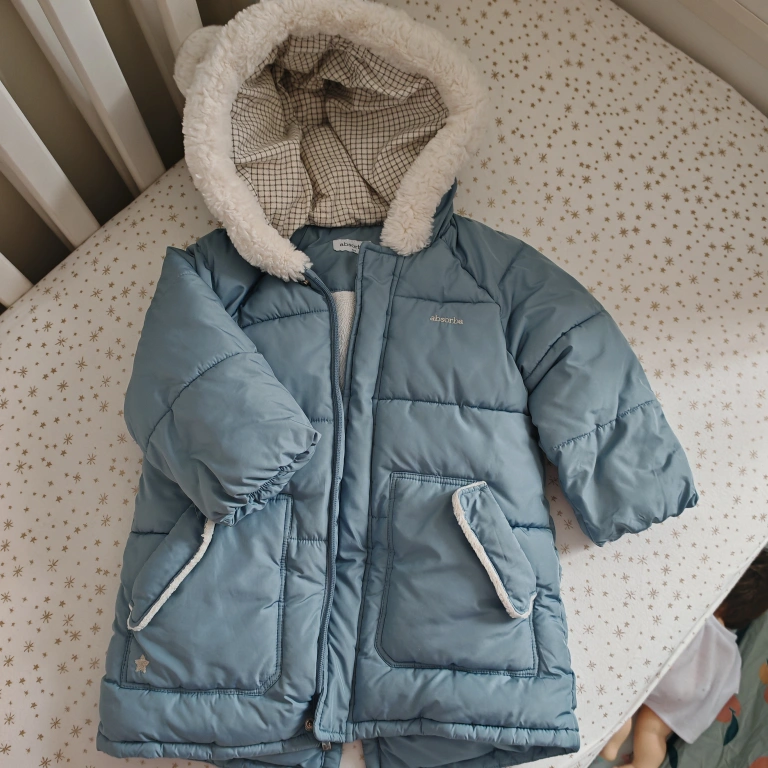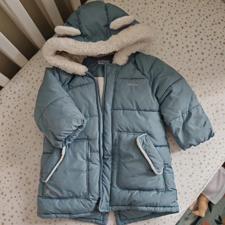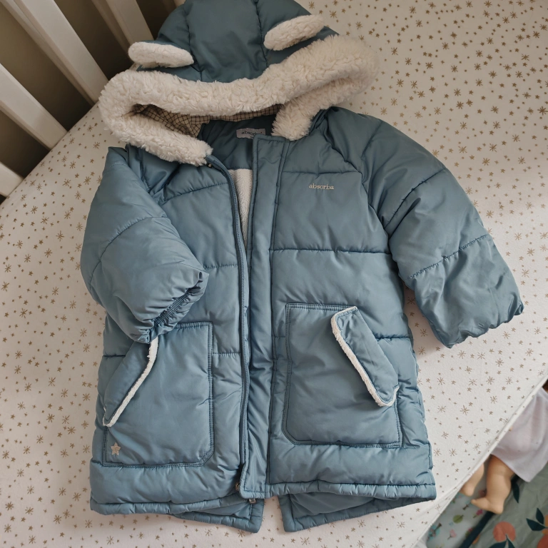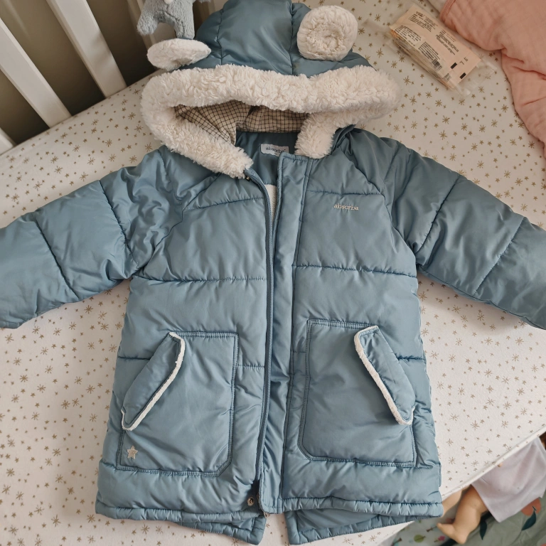 Baby’s blue puffer jacket. Features a sherpa-lined hood with cute bear ears. Zipper closure. Two pockets. Warm and cozy.