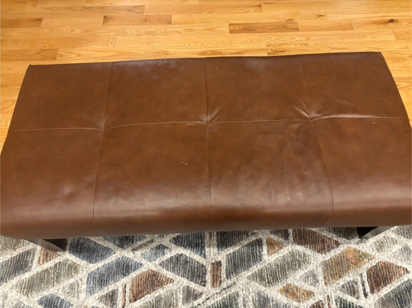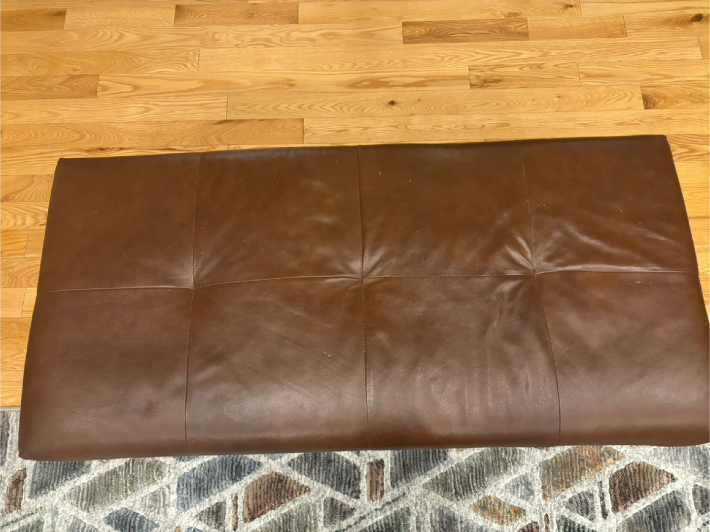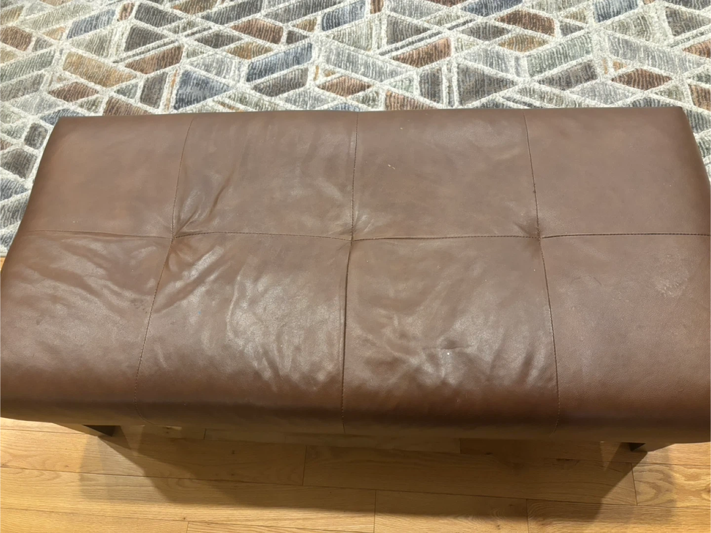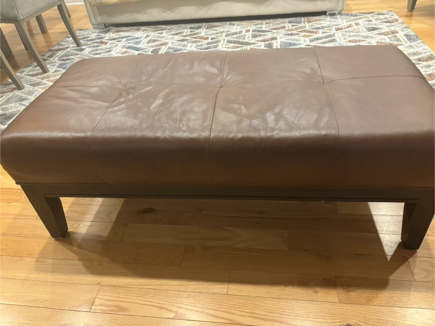 This is a brown tufted ottoman bench. It has a tufted top and a dark wood frame with dark wood legs. Its storage functionality makes it handy for keeping living spaces tidy.