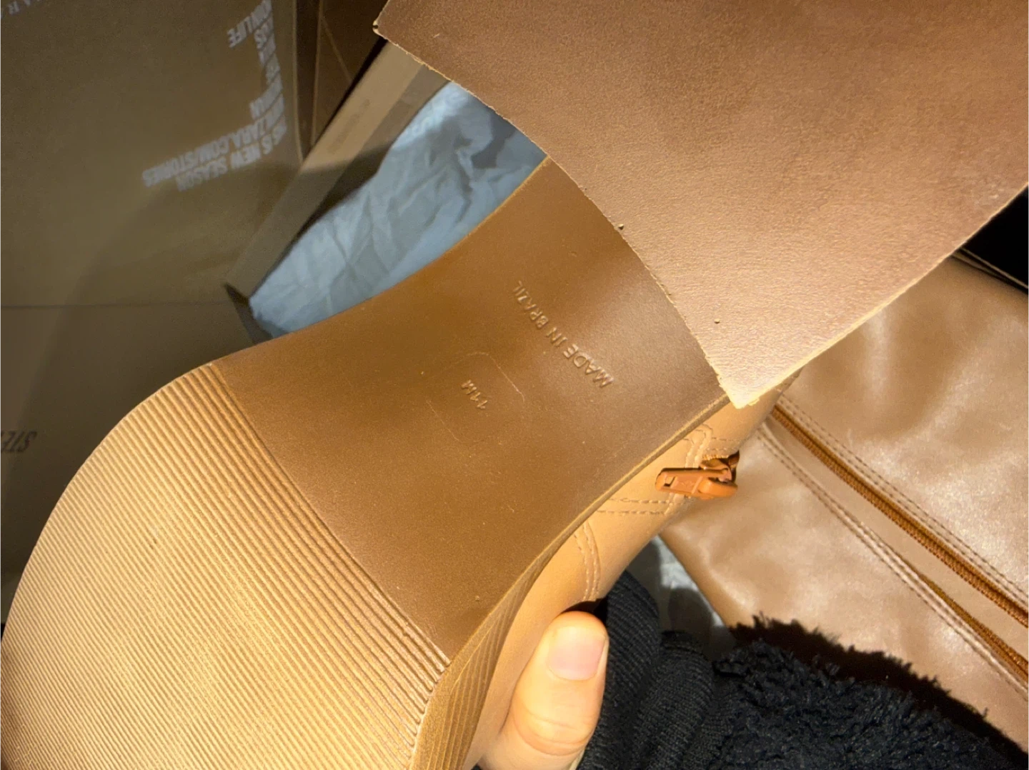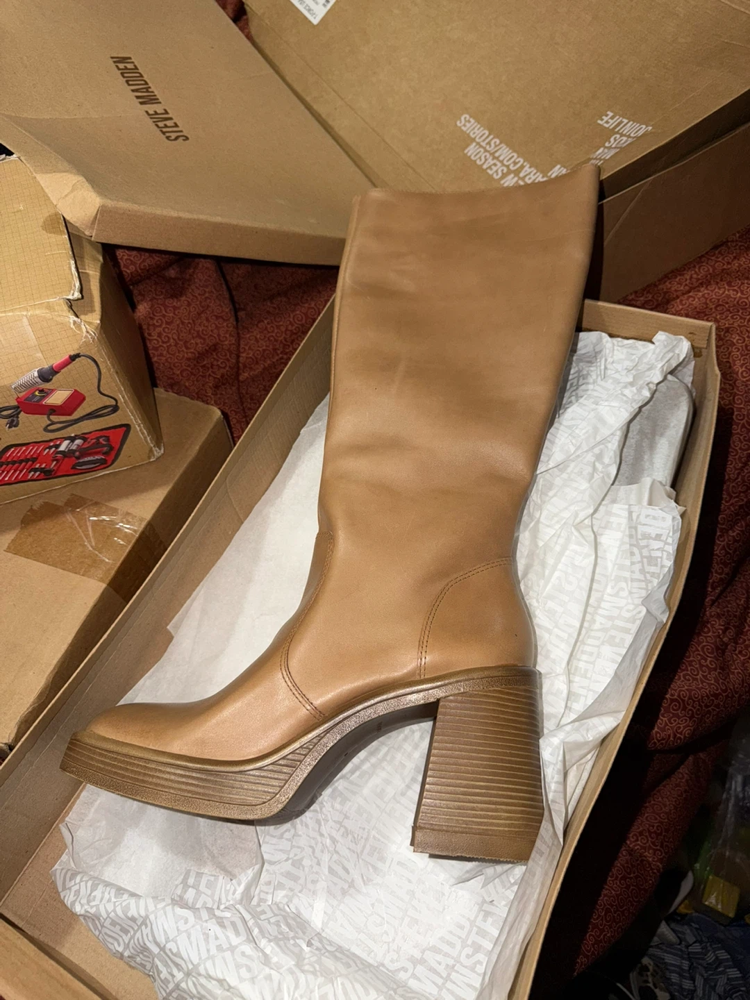 These Steve Madden knee-high boots are a chic tan color. They feature a side zipper and a chunky platform heel. Boots come in original box.