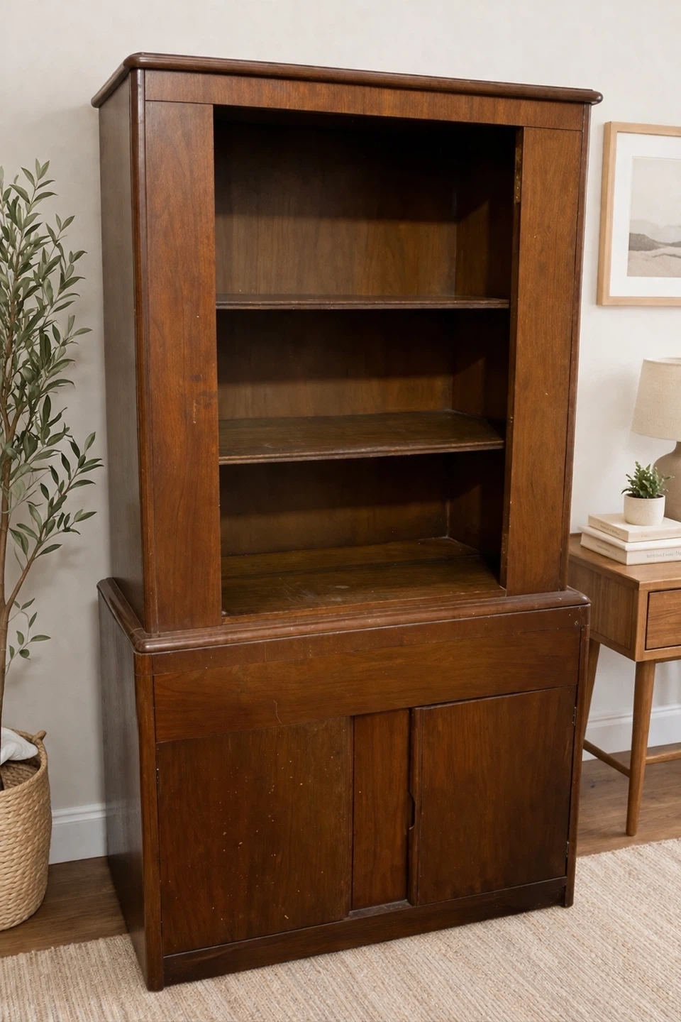 This mid century modern Mcm vintage wooden bookcase features open shelving above a two-door cabinet. It's made of dark stained wood with a rich finish. Perfect for storing books or displaying decor!