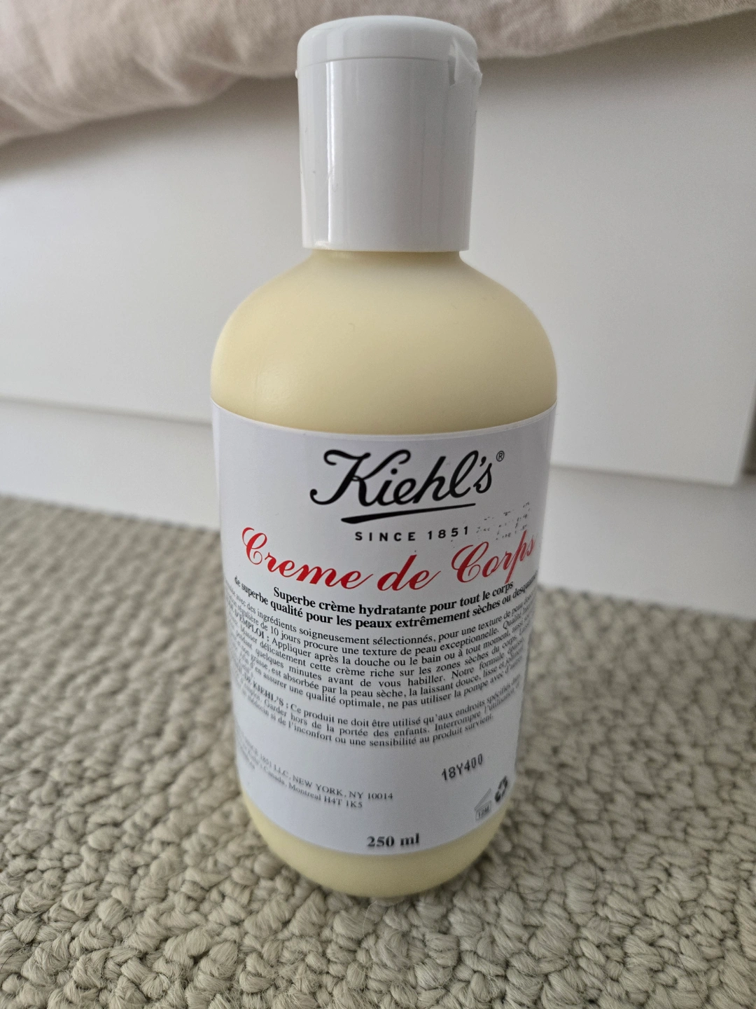 Kiehl's Creme de Corps body lotion. Hydrating cream for extremely dry skin. 250ml bottle. Smooth texture.
