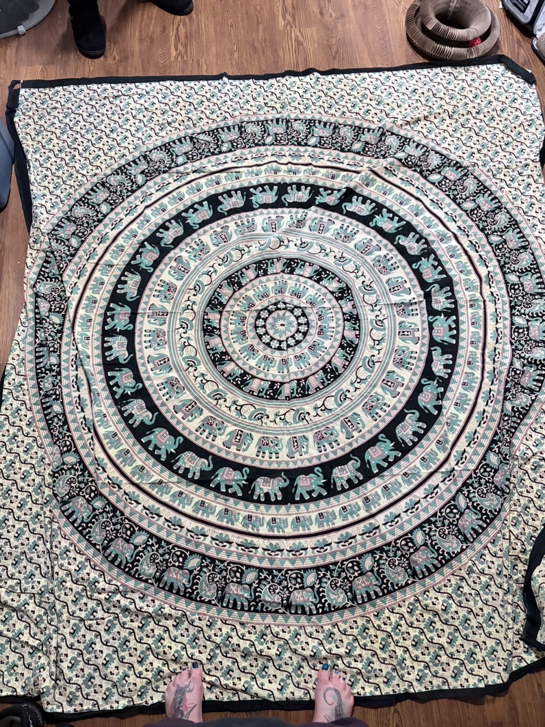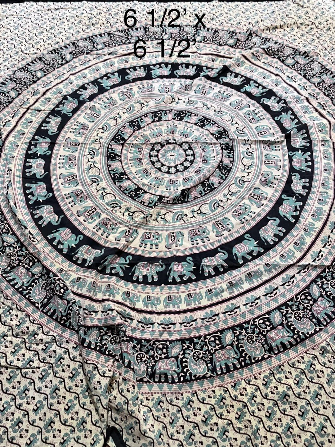 This round tapestry features a vibrant elephant mandala design. It's made of fabric and measures 6.5 by 6.5 feet. Perfect for adding a bohemian touch to your living space! some small rips at corners but still good!