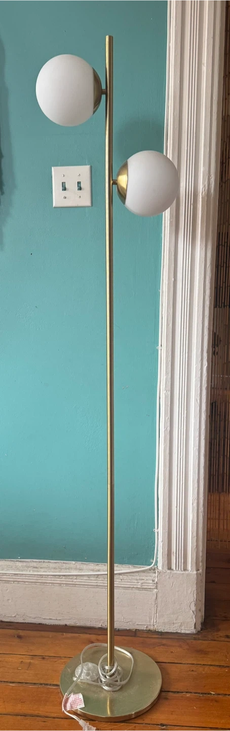 Like new! This modern floor lamp features a sleek brass finish and two white globe shades. It stands tall, providing ambient lighting. The metal base offers stability for the lamp's design.