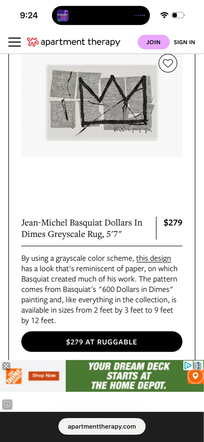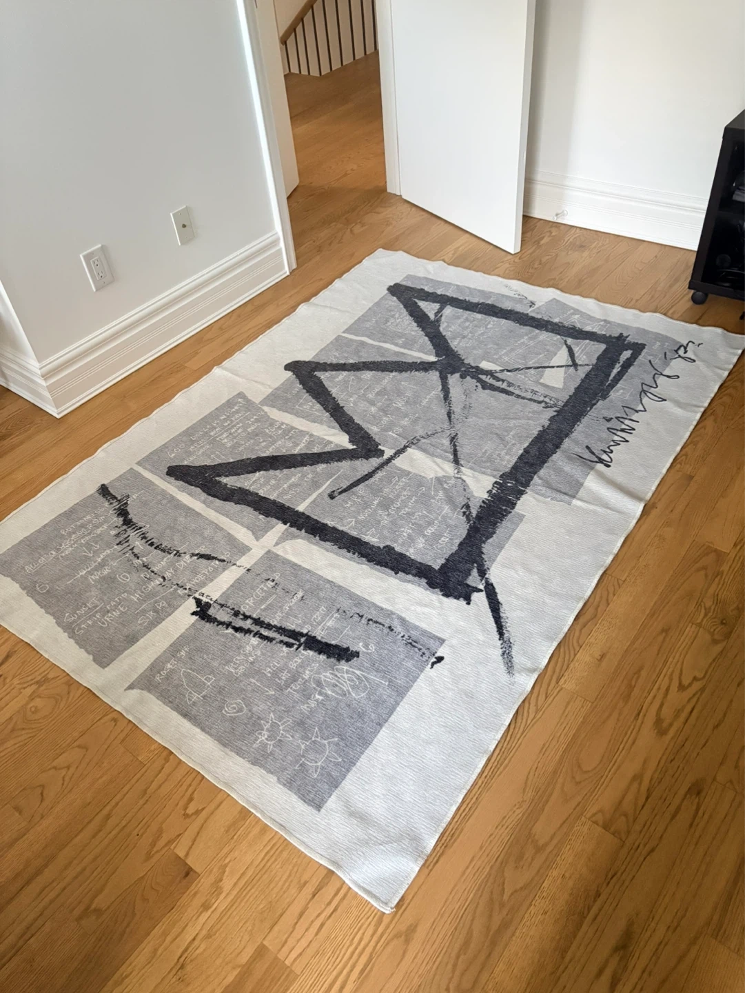 Great for Art enthusiasts. This rug features a greyscale design reminiscent of Basquiat's "600 Dollars in Dimes" painting. It's available in a 5 x 7 size.