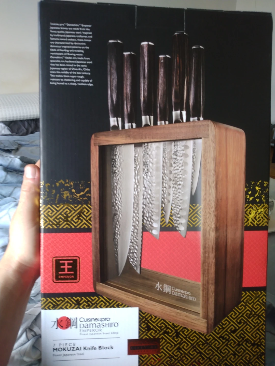This is a Cuisine::pro 7 piece "Emperor" Mokuzai knife block set. It includes a paring knife, utility knife, two santoku knives, bread knife, and chefs knife. The knives are made from Japanese steel and feature hammered Damascus patterns.