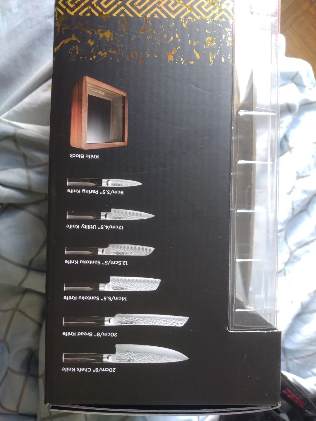 This is a Cuisine::pro 7 piece "Emperor" Mokuzai knife block set. It includes a paring knife, utility knife, two santoku knives, bread knife, and chefs knife. The knives are made from Japanese steel and feature hammered Damascus patterns.