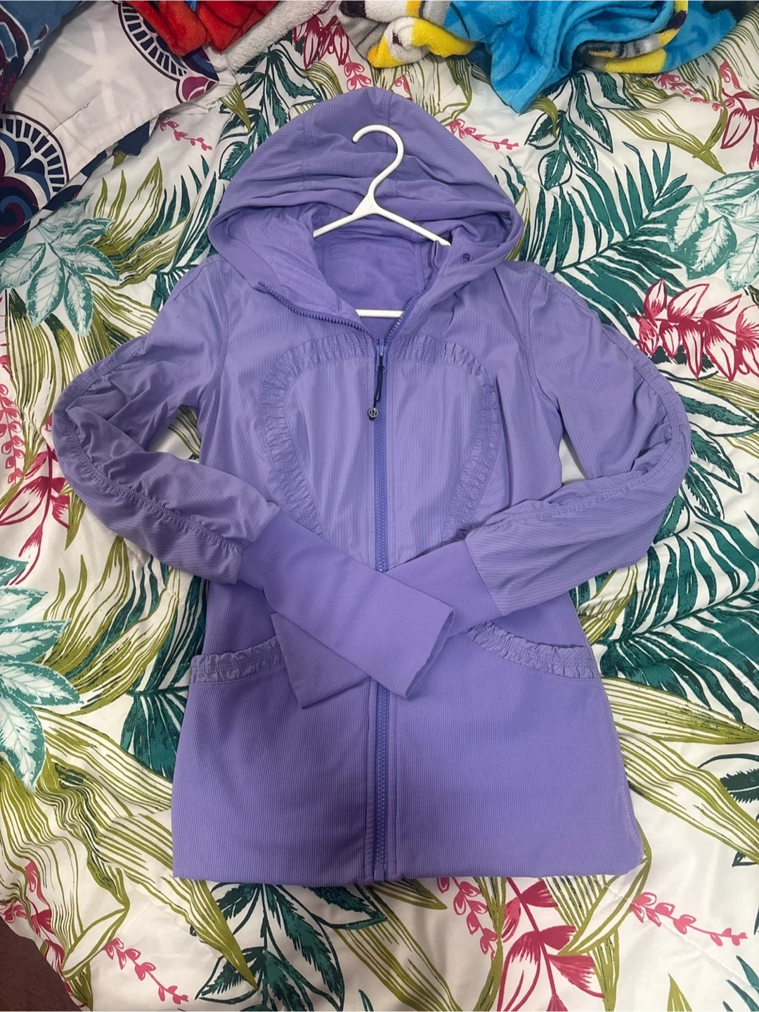 Lightweight Lululemon hooded jacket in a soft lavender colour. It features a full zip and thumbholes. Material is a blend of polyester and lycra. Size 6 Pick up cash only