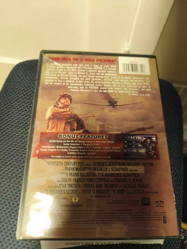 Own a piece of cinematic history with this Fox War Classics Patton DVD, starring George C. Scott and Karl Malden. This DVD is in good condition and ready to be enjoyed by any film enthusiast or history buff. It offers a compelling look into the life and times of one of history's most complex military figures. Digitally Mastered, THX for superior sound, Aspect Ratio 2.35:1, English 5.1 Dolby. Priced for a quick sale. If you're reading this, it's still available!