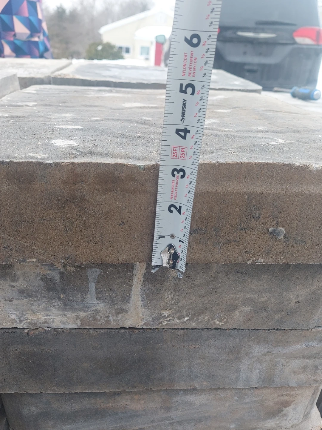 Selling a quantity of concrete pavers suitable for landscaping projects. These pavers are a greyish-brown colour and appear to be made of concrete. They are stacked on a pallet, A tape measure is shown in the photos for scale, indicating a thickness of approximately 3.5 inches and a width of around 13.5 inches for some units.