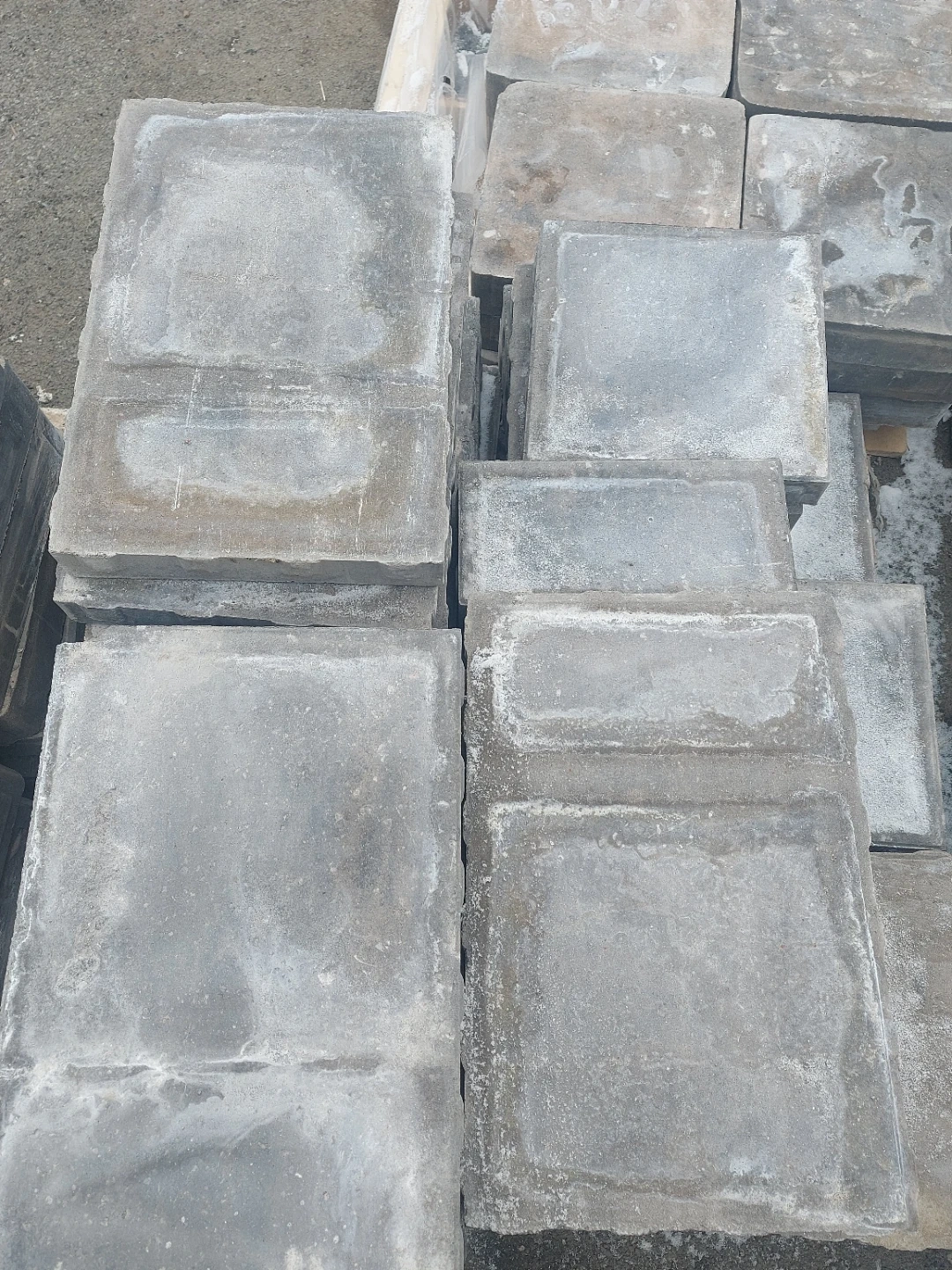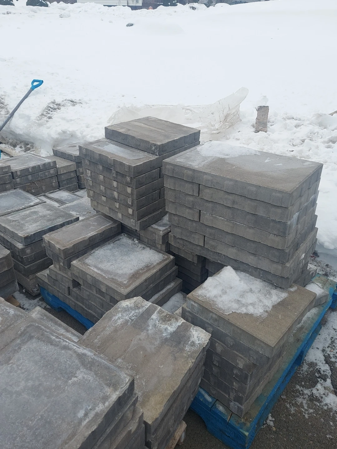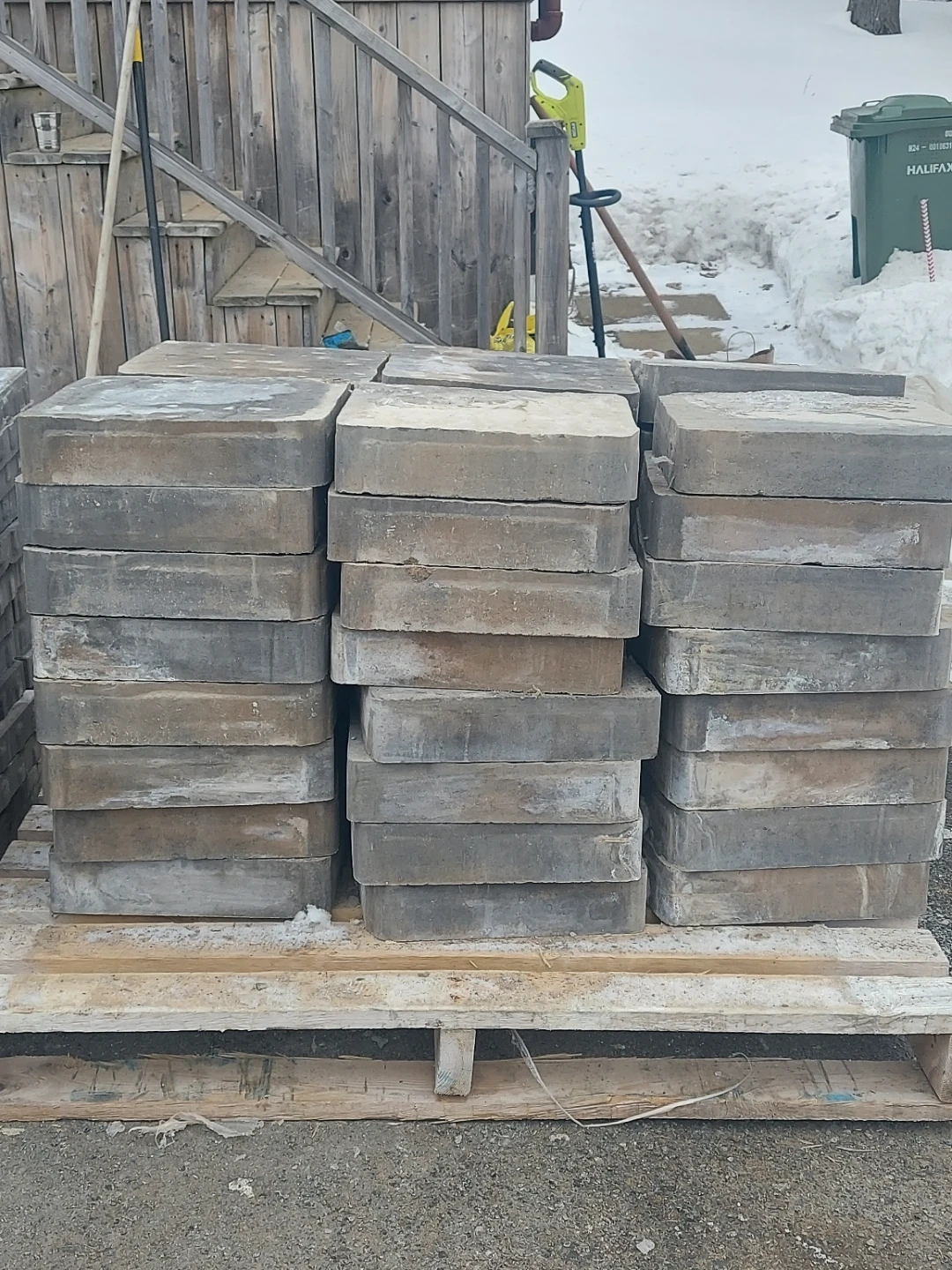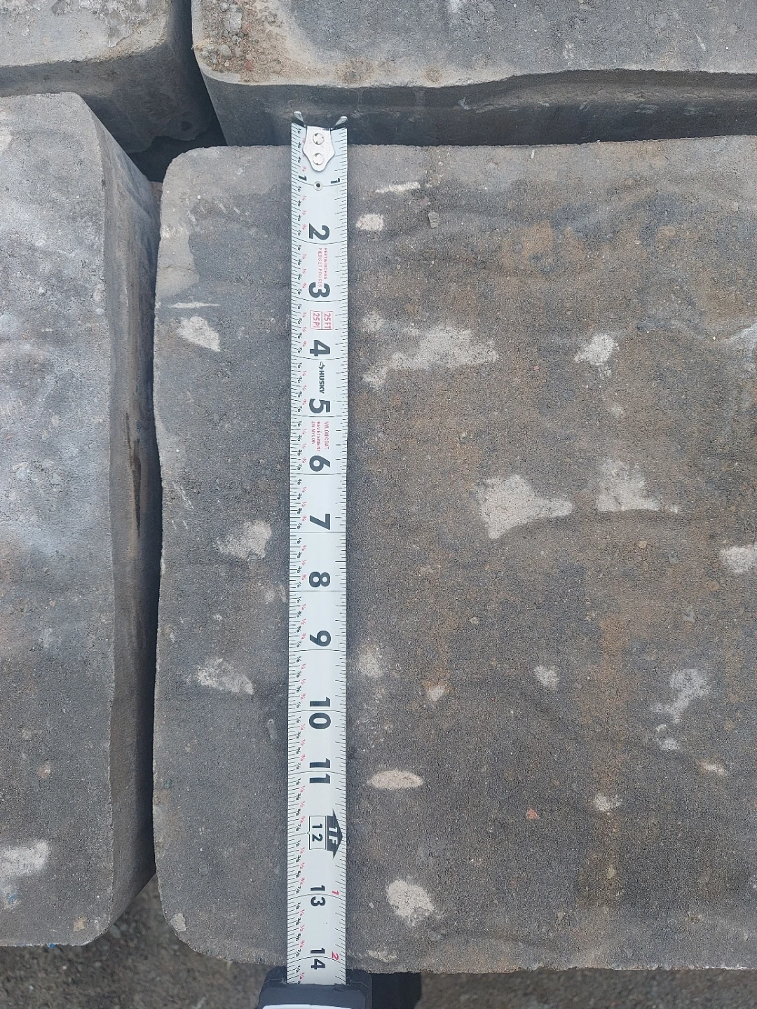 Selling a quantity of concrete pavers suitable for landscaping projects. These pavers are a greyish-brown colour and appear to be made of concrete. They are stacked on a pallet, A tape measure is shown in the photos for scale, indicating a thickness of approximately 3.5 inches and a width of around 13.5 inches for some units.