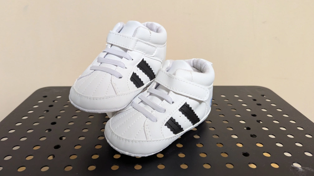 These white baby shoes have the classic Adidas style with the three black stripes! They're brand new and ready for your little one to wear. Perfect for infants!