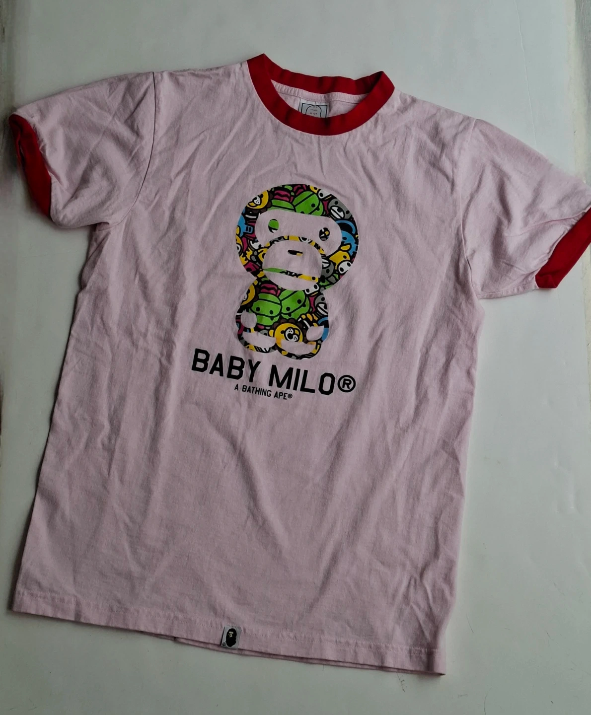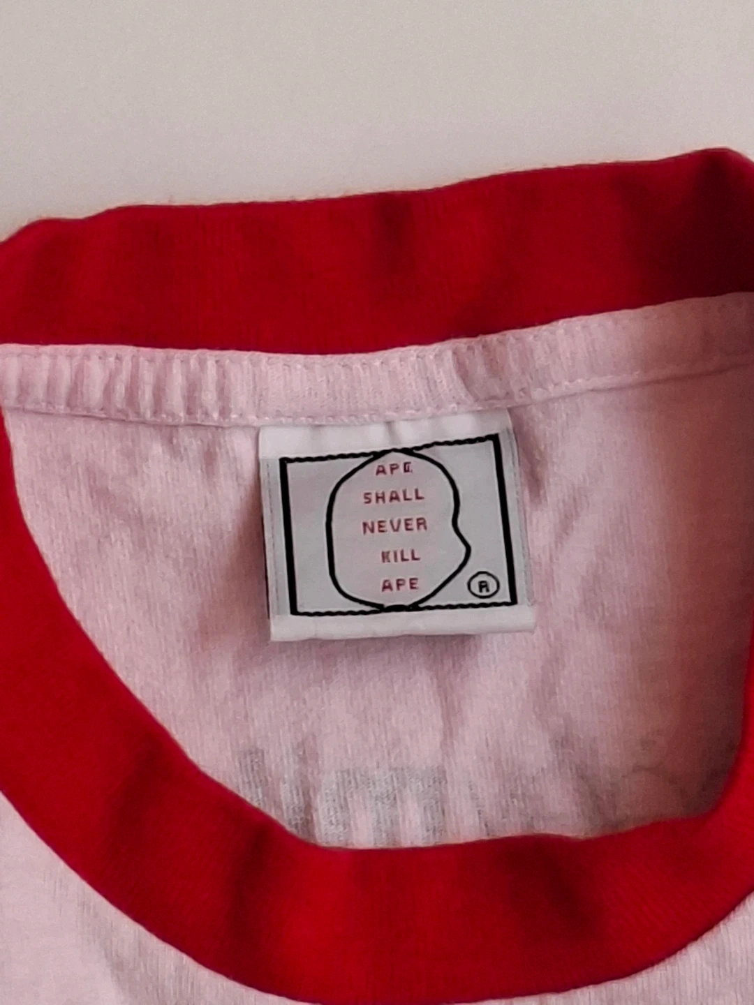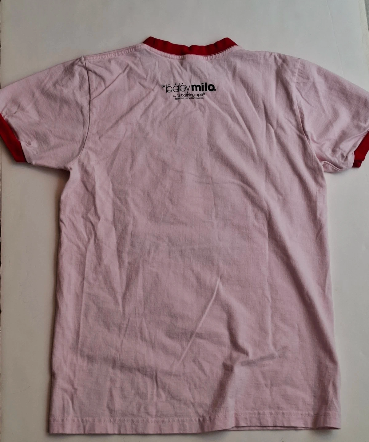 Cute pink BAPE Baby Milo ringer tee. Has the iconic colorful monkey graphic on front. Red trim on collar and sleeves. Made of 100% cotton.
