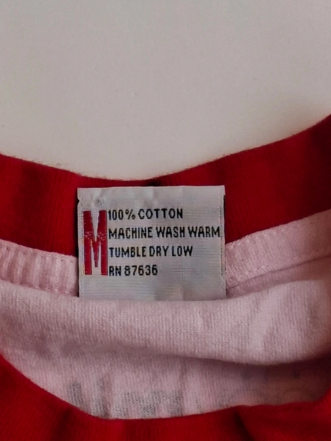 Cute pink BAPE Baby Milo ringer tee. Has the iconic colorful monkey graphic on front. Red trim on collar and sleeves. Made of 100% cotton.
