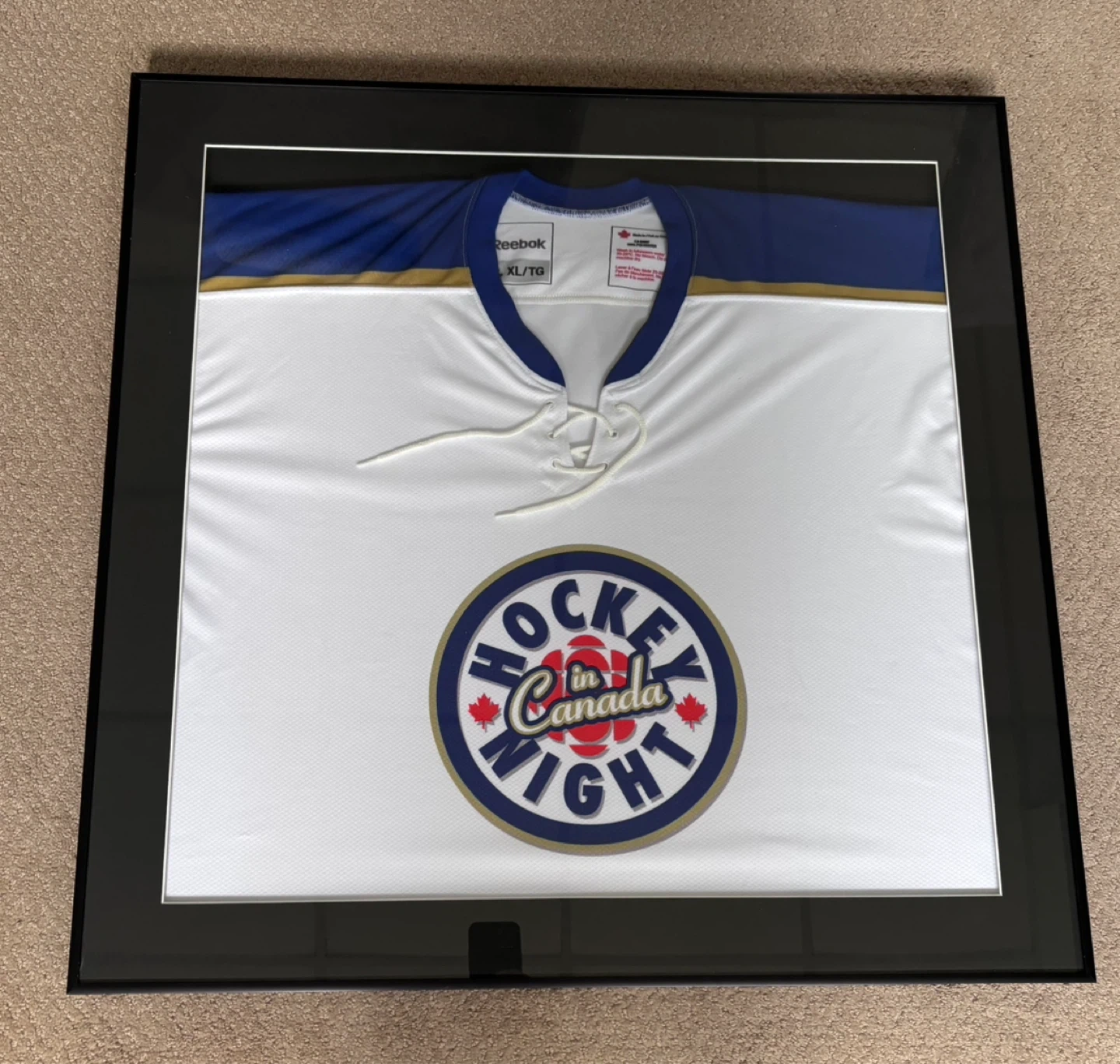 This framed Reebok jersey celebrates Hockey Night in Canada. It's a size XL/TG. The jersey is white with blue and gold accents, featuring the "Hockey Night in Canada" logo prominently displayed. It's ready to hang, making it a great addition for any hockey fan!
