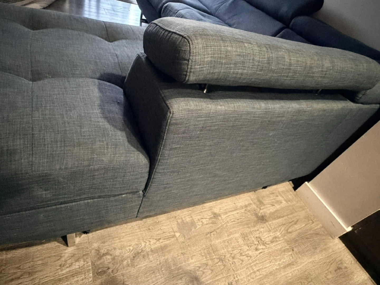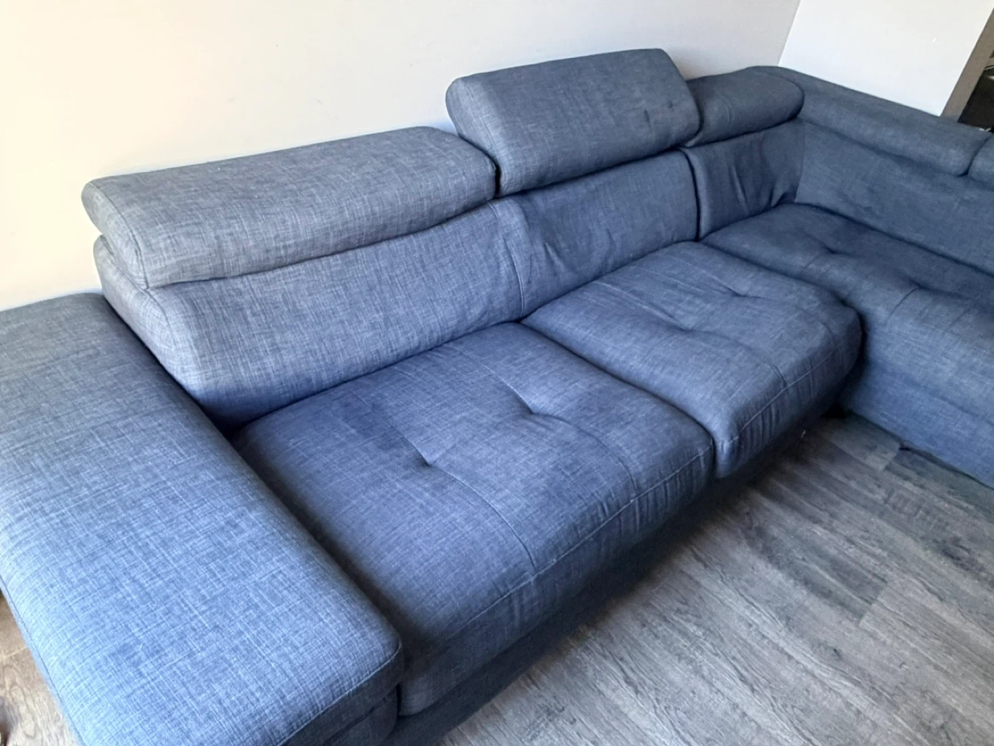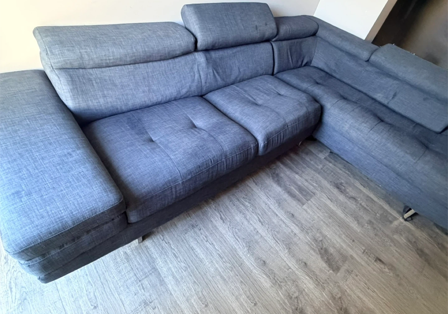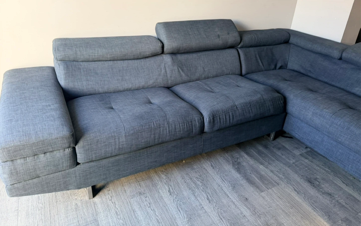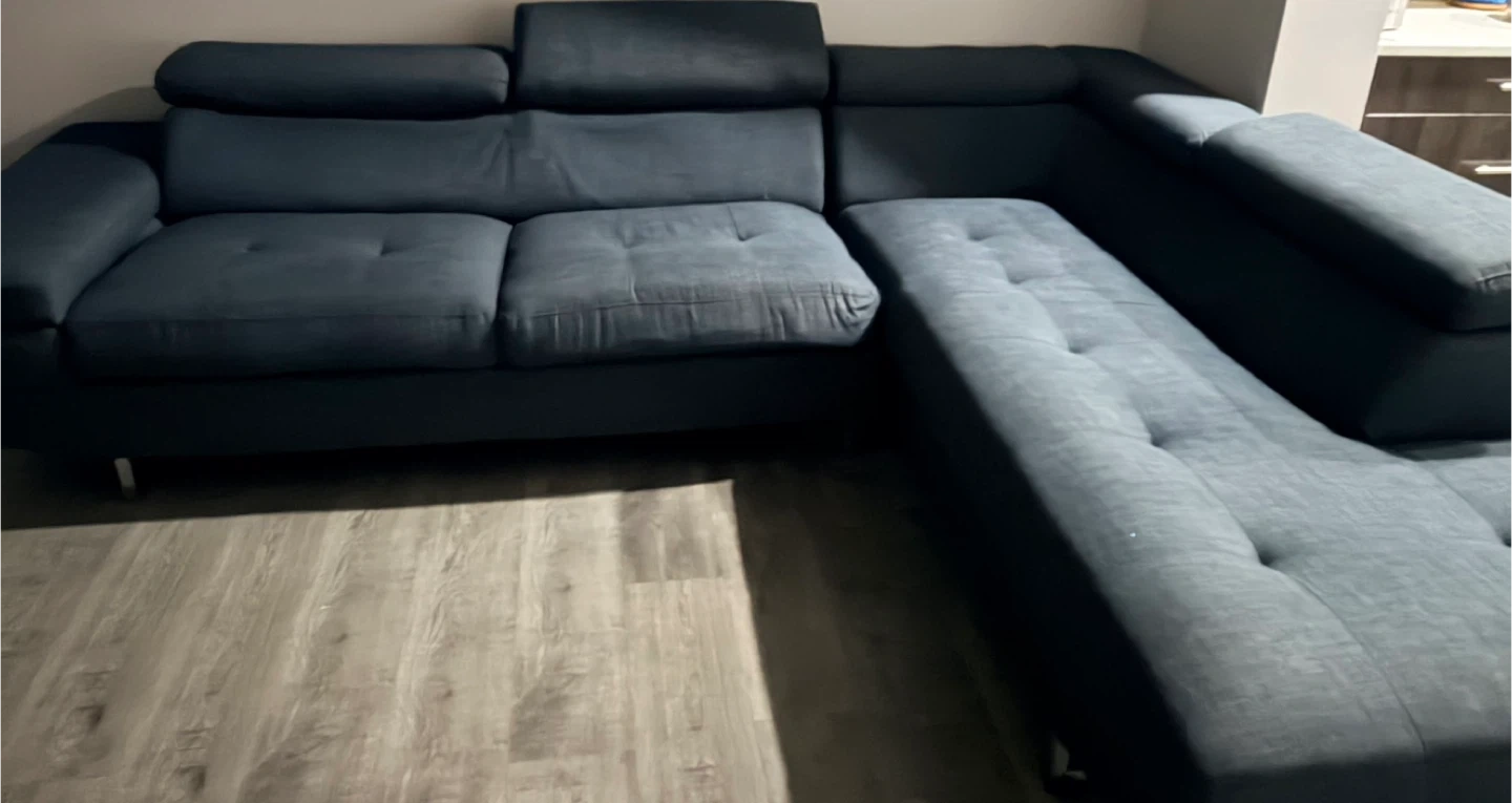 It's a dark grey sectional sofa. Features adjustable headrests for added comfort. Upholstered in a textured fabric. Provides ample seating for a living room. Very comfortable and neat.delivery available.