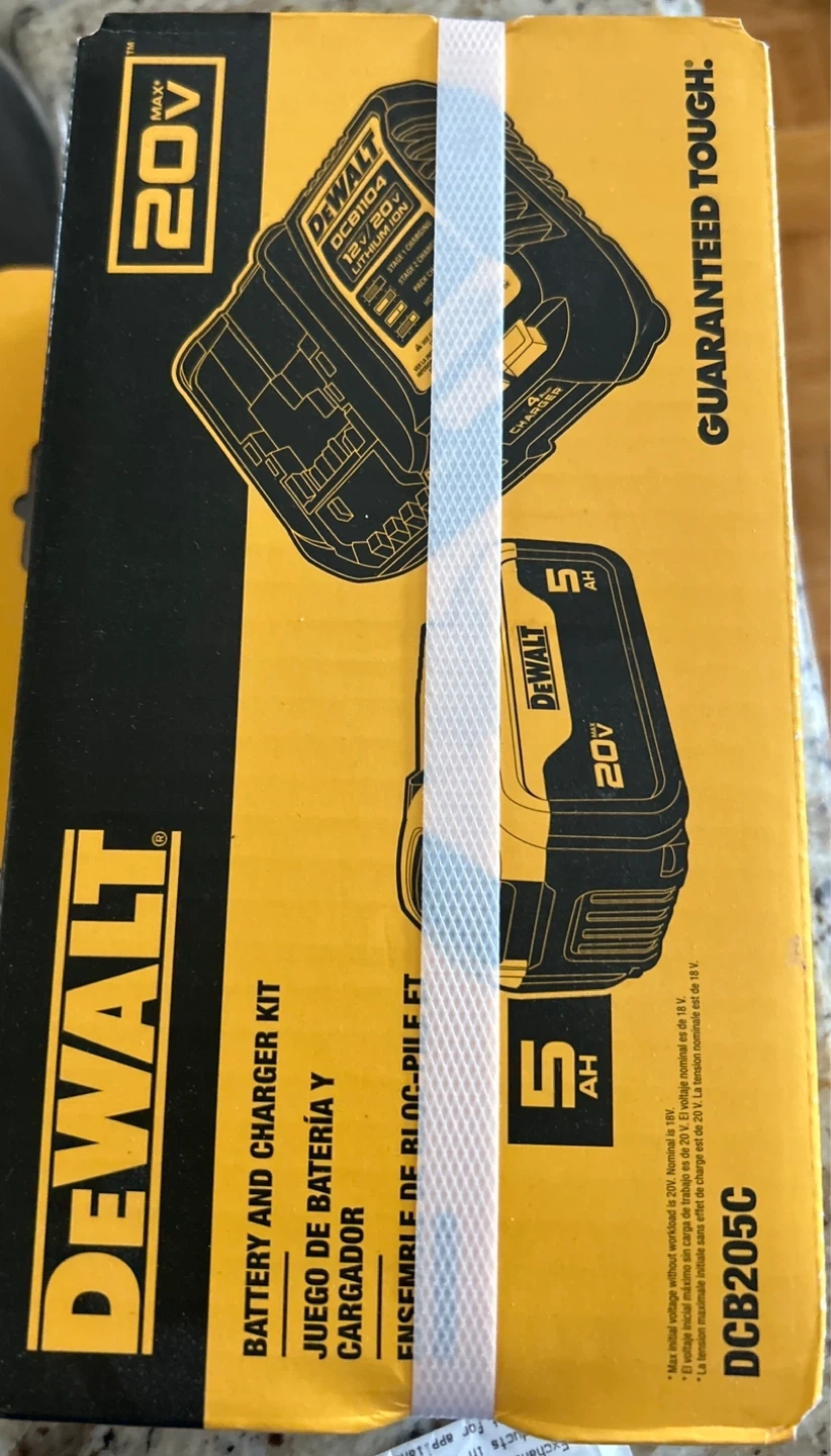 This is a DEWALT 20V MAX battery and charger kit. It includes one 5.0 Ah battery and the DCB1104 charger. The battery's initial voltage without workload is 20V, with a nominal of 18V. This kit is useful for powering various DEWALT 20V tools. I have the receipt for warranty brand new in box