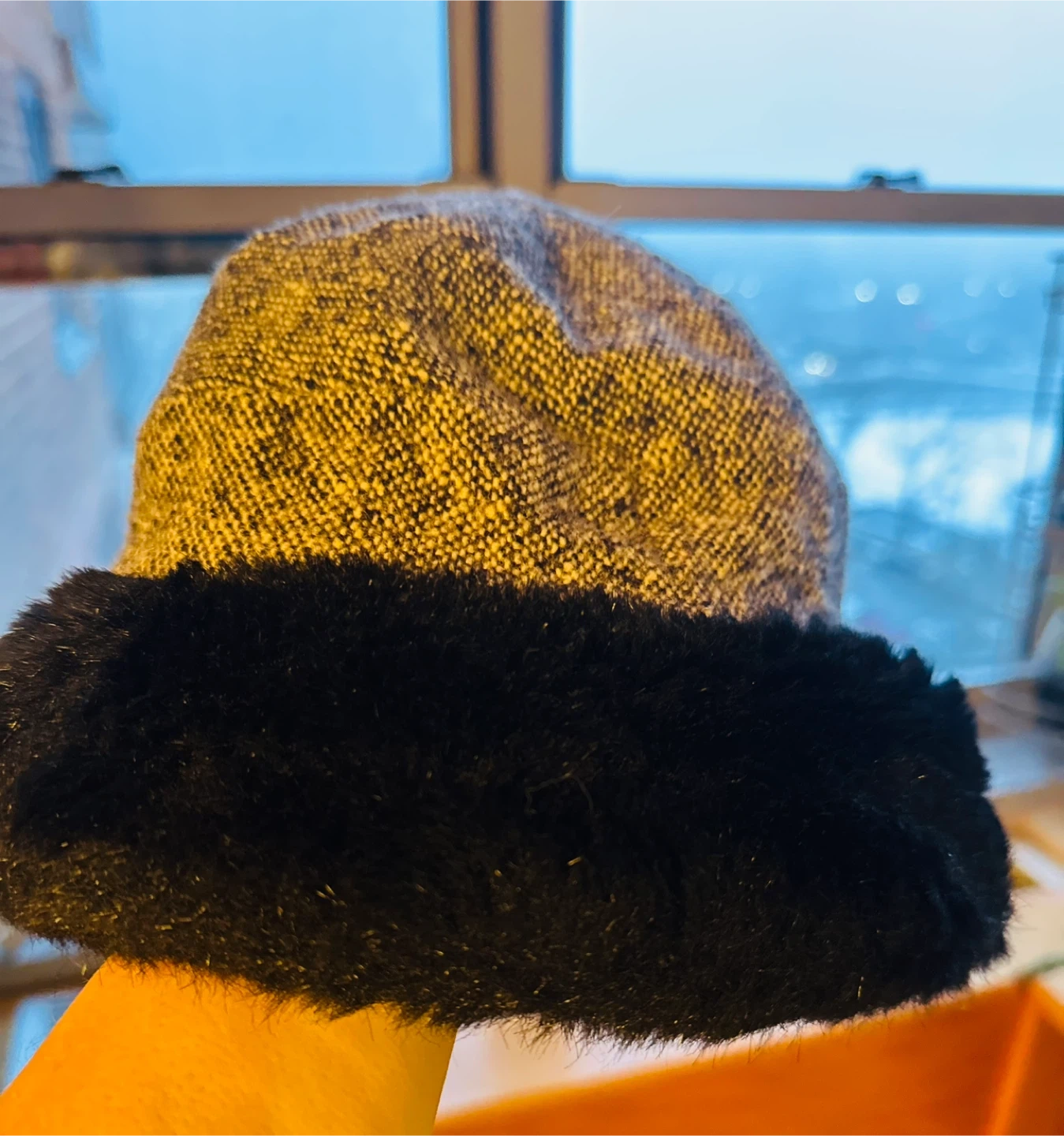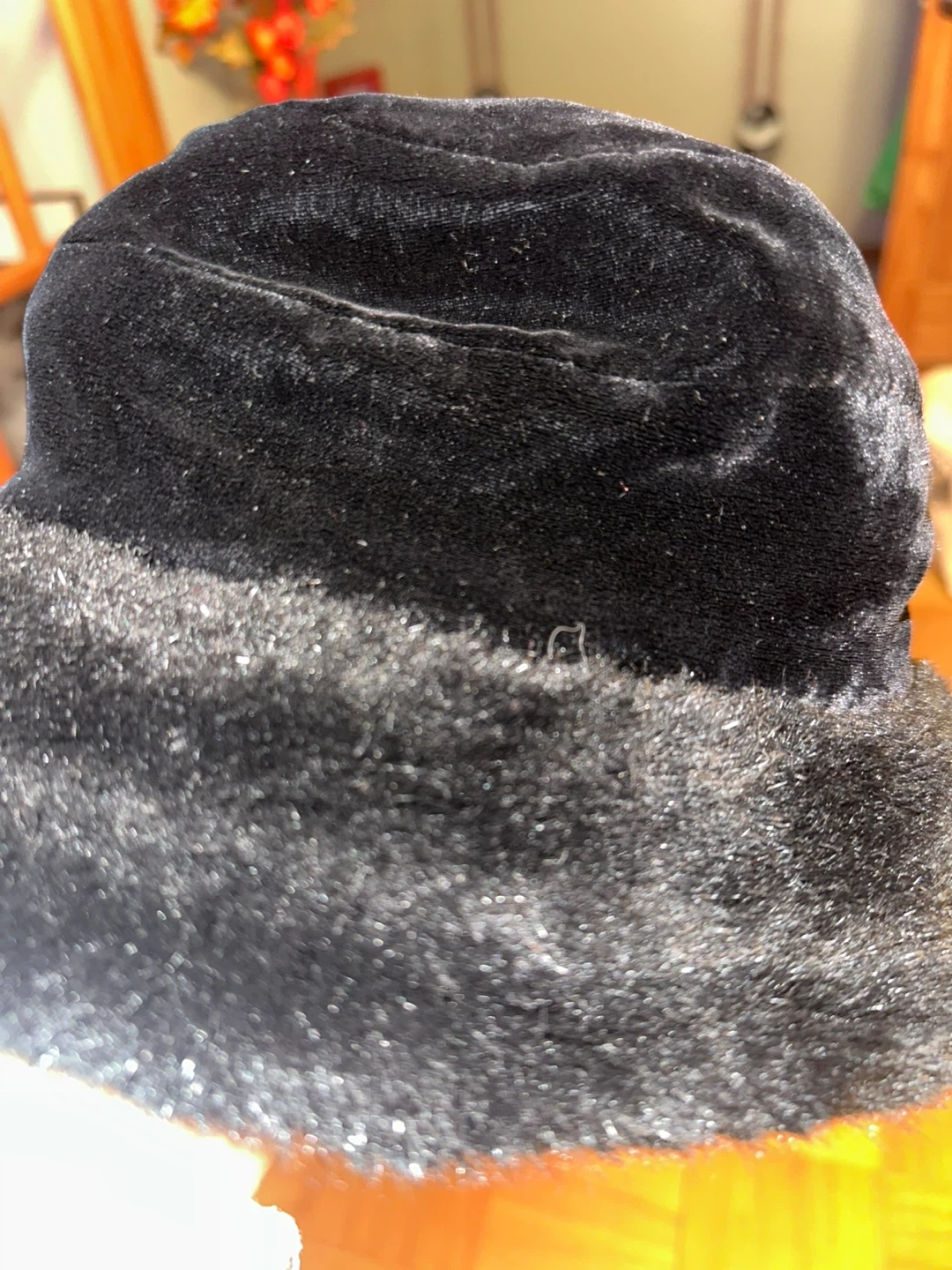 This black bucket hat features a soft velvet crown with a plush faux fur trim. It's a stylish accessory for cooler weather. Material is velvet and faux fur.