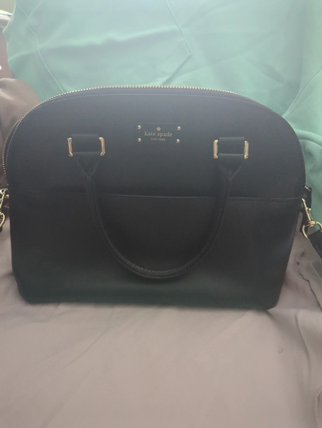 This is a black leather dome satchel handbag from Kate Spade. It features a pebbled leather exterior and gold-tone hardware. The interior is lined with Kate Spade patterned fabric and includes multiple pockets for organization. It has top handles and a detachable shoulder strap.
