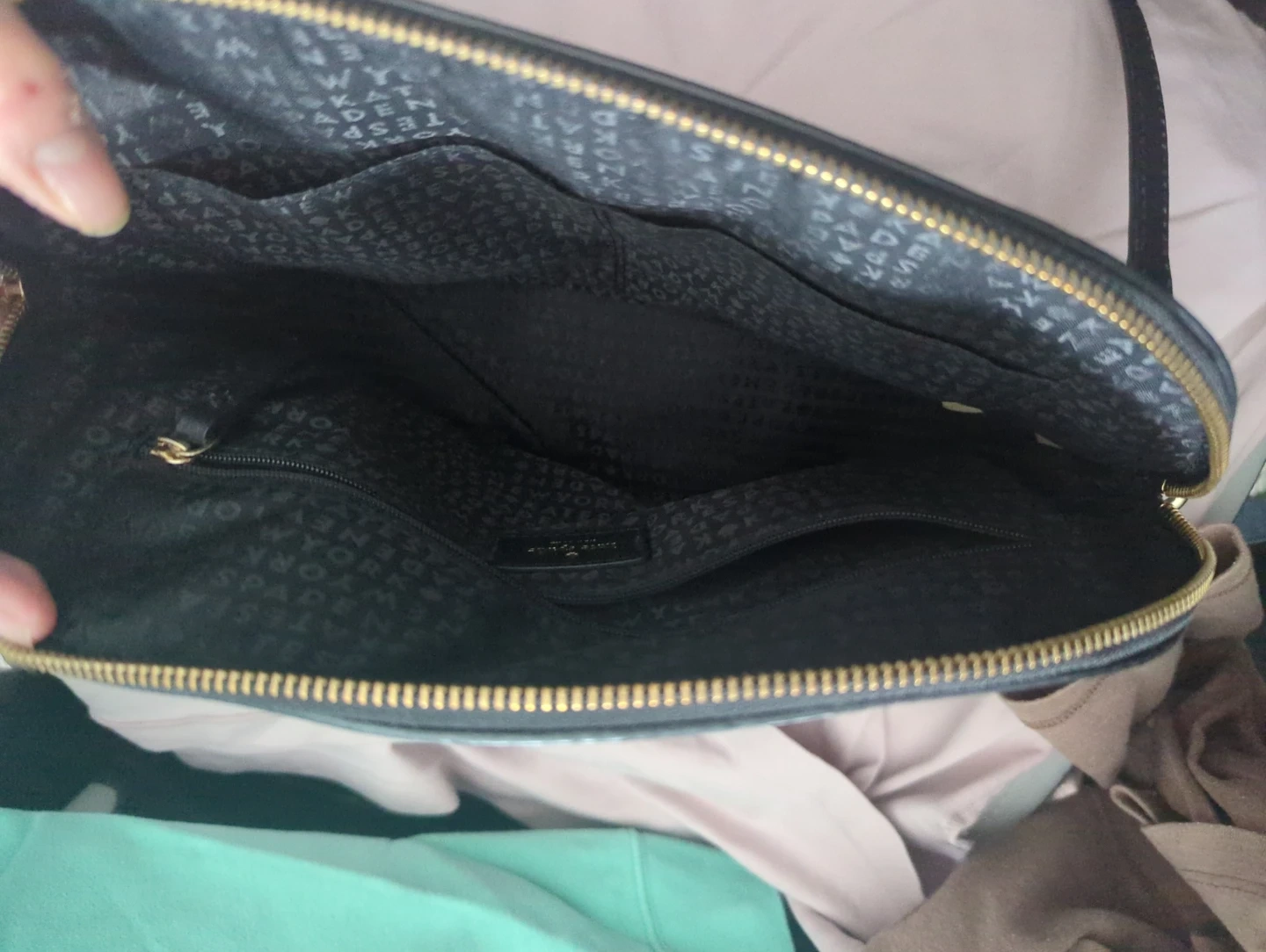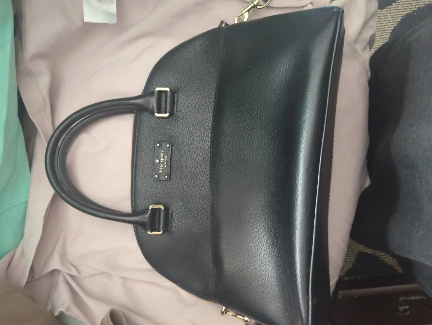 This is a black leather dome satchel handbag from Kate Spade. It features a pebbled leather exterior and gold-tone hardware. The interior is lined with Kate Spade patterned fabric and includes multiple pockets for organization. It has top handles and a detachable shoulder strap.
