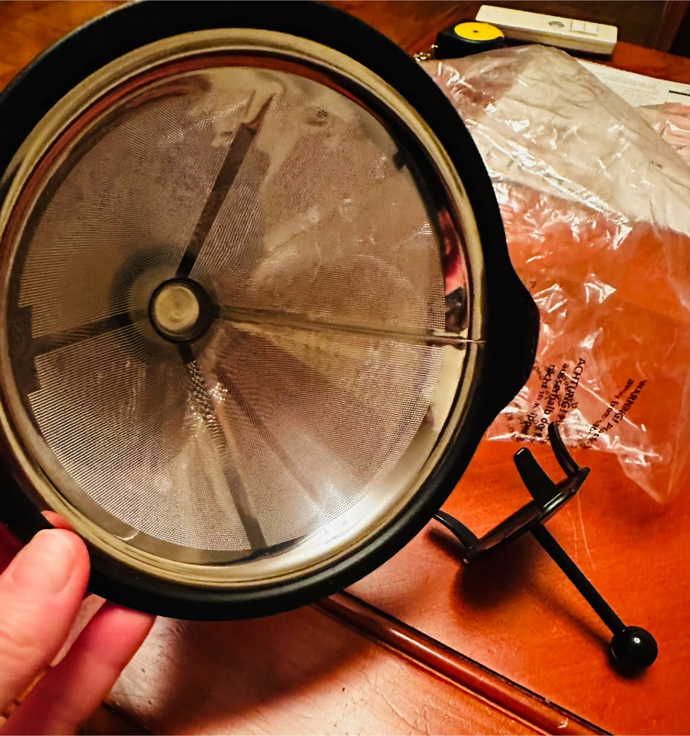 This is a Bodum stainless steel pour-over coffee filter cone. It's designed for brewing single cups of coffee. The cone features a fine mesh filter and a silicone base. It comes with a separate black handle piece.